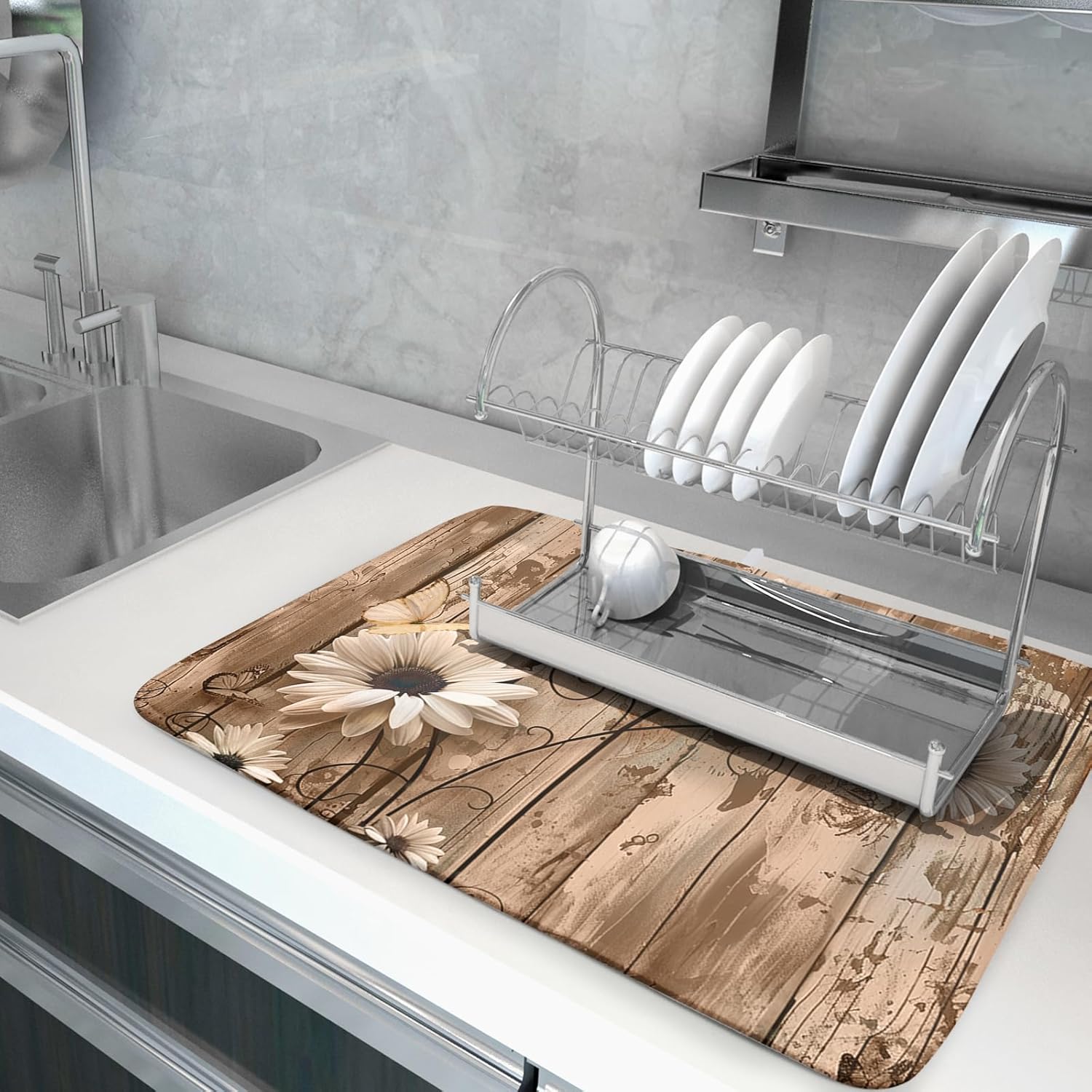 Summer Daisy Flowers Dish Drying Mat for Kitchen Counter 18x24 Inch Rustic Daisy Absorbent Dish Drying Mat Wood Microfiber Reversible Drying Pad Dish Drainer Mat for Countertops Tableware Decor