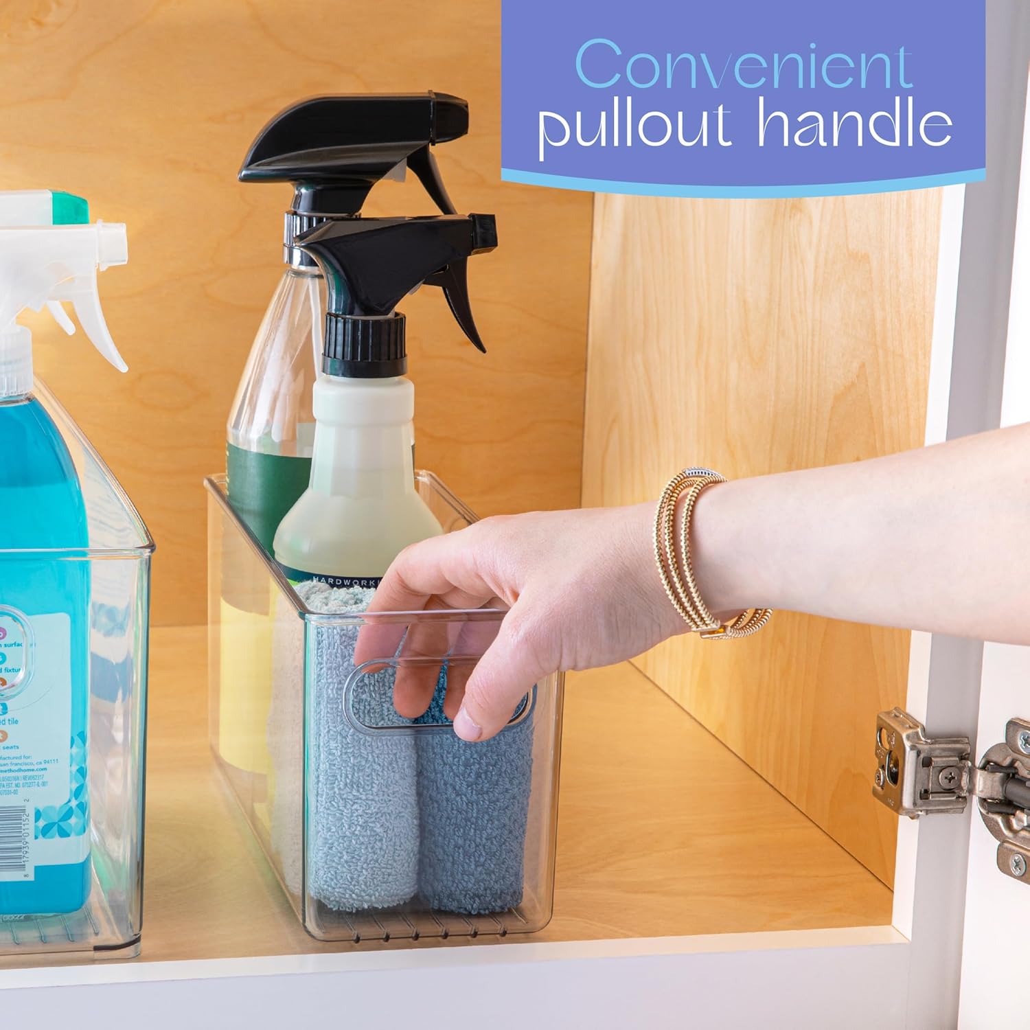 Plastic Food Storage 4 Pack Clear Container Bin with Handles for Organizing Kitchen, Pantry, Refrigerator, Freezer, Pantry, Cabinet, Closet, Bathroom. 10”x4”x5”