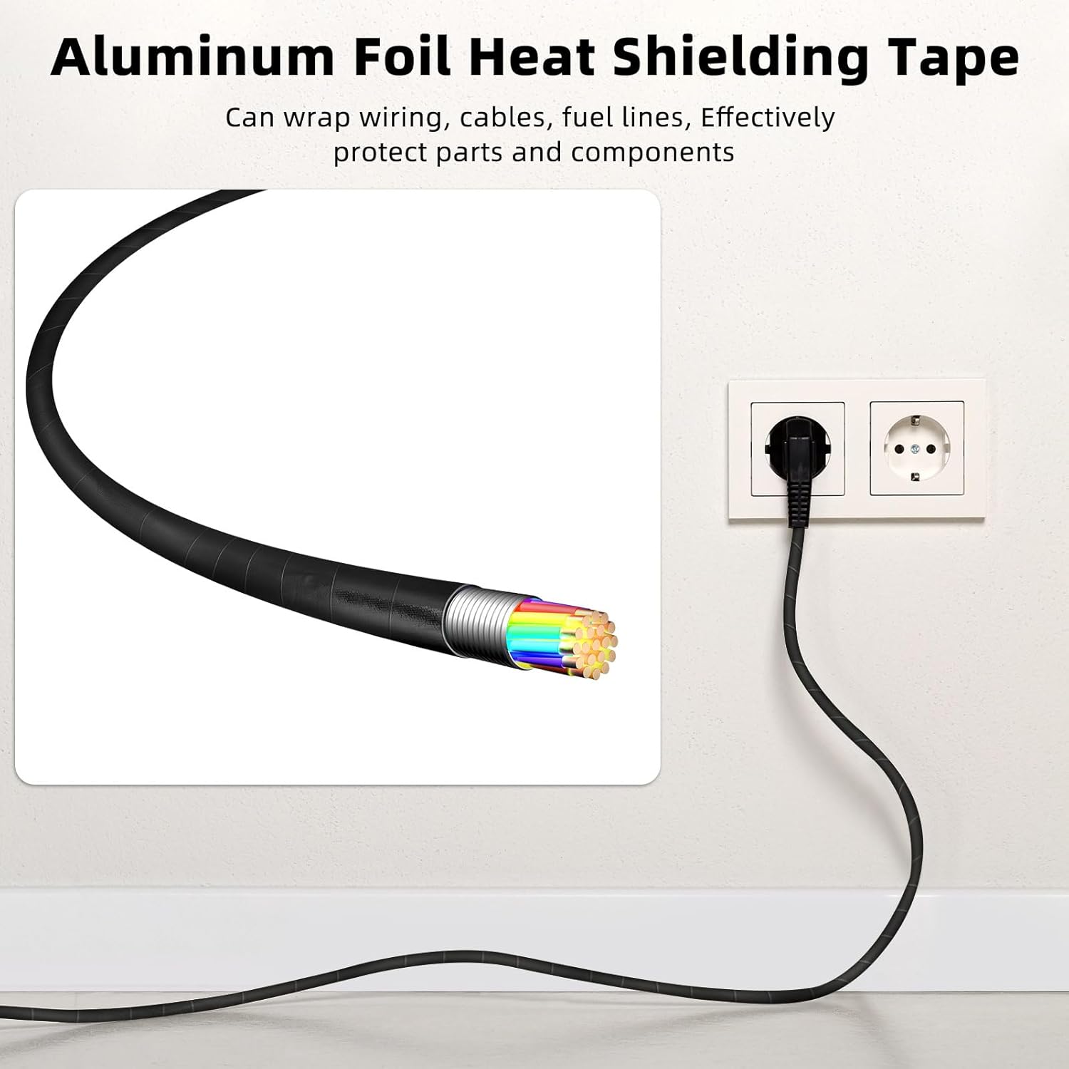- Quality Material: the adhesive heat shield tape is made of glass fiber fabric with an aluminized outer facing, which is elasticity, wear resistance, heat insulation, high temperature resistant, corrosion resistant and waterproof, and strong adhesion; This foil tape can provide ultimate protection from extreme heat as well as oil spills, dirt, grease and road grime