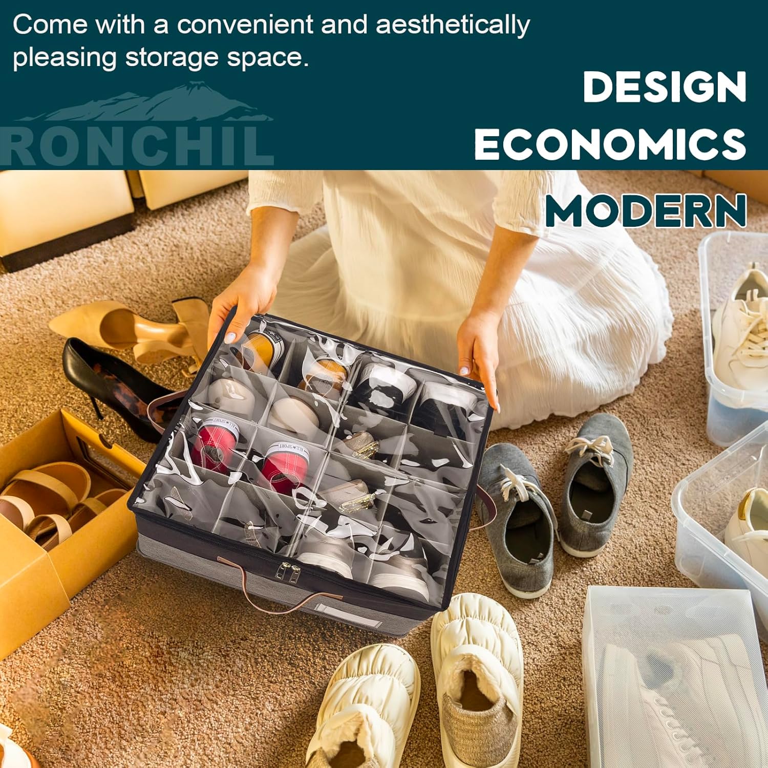 Shoe Organizer for Closet, Foldable Shoe Storage Bins with Clear Cover, Space Saving Shoes Holder with 4 Handles, Large Adjustable Shoe Box Storage Containers, Fits 8-16 Pairs, 2 Pack, Black