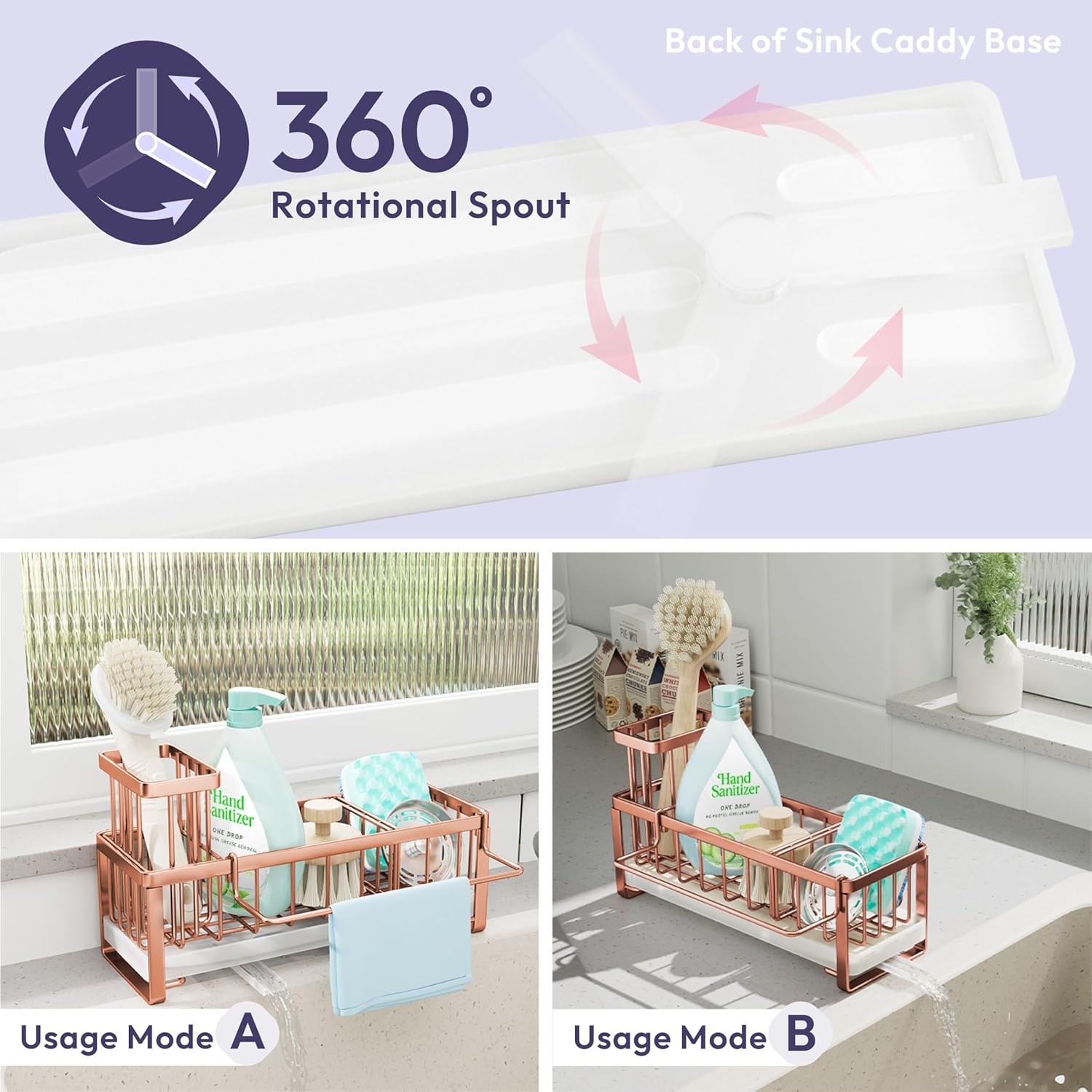 - [Automatic Draining]: Are you tired of cleaning the countertop?SWTYMIKI sponge holder for kitchen sink with 360Β° rotatable draining pipe can help you! Just put the sink caddy next to the sink, the water will drain automatically into the sink