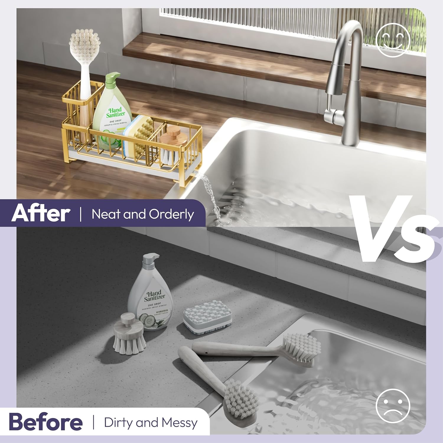 - [Large Storage Space Kitchen Essentials]: Our kitchen sink caddy organizer will give you a neat and clean kitchen for its strong storage capacity. Soap holder can hold three brushes, one rubber plug and a sponge, one bottle of soap dispenser-no swinging and no falling