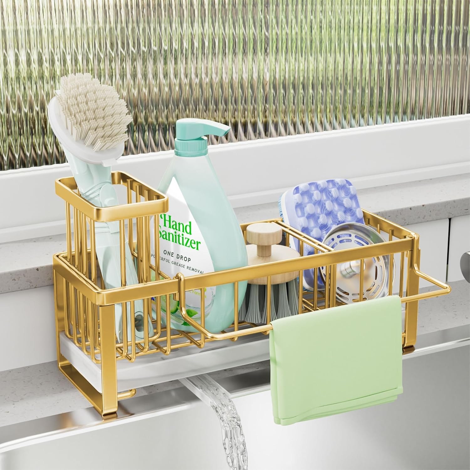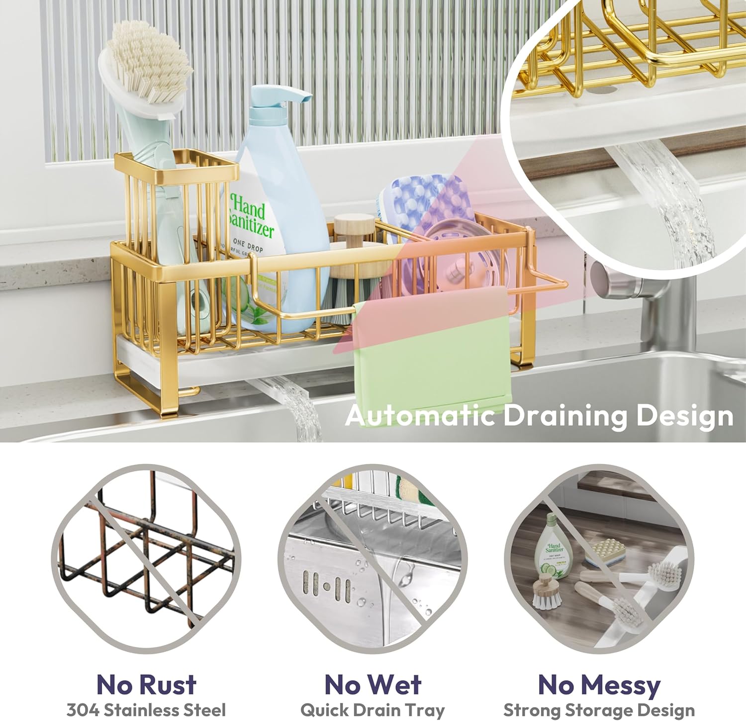 SWTYMIKI Sponge Holder for Kitchen Sink - Sink Caddy with Brush Holder Self-draining Sponge Caddy Organizer with Divider Stainless Steel Kitchen Accessories Storage for Countertop, Gold