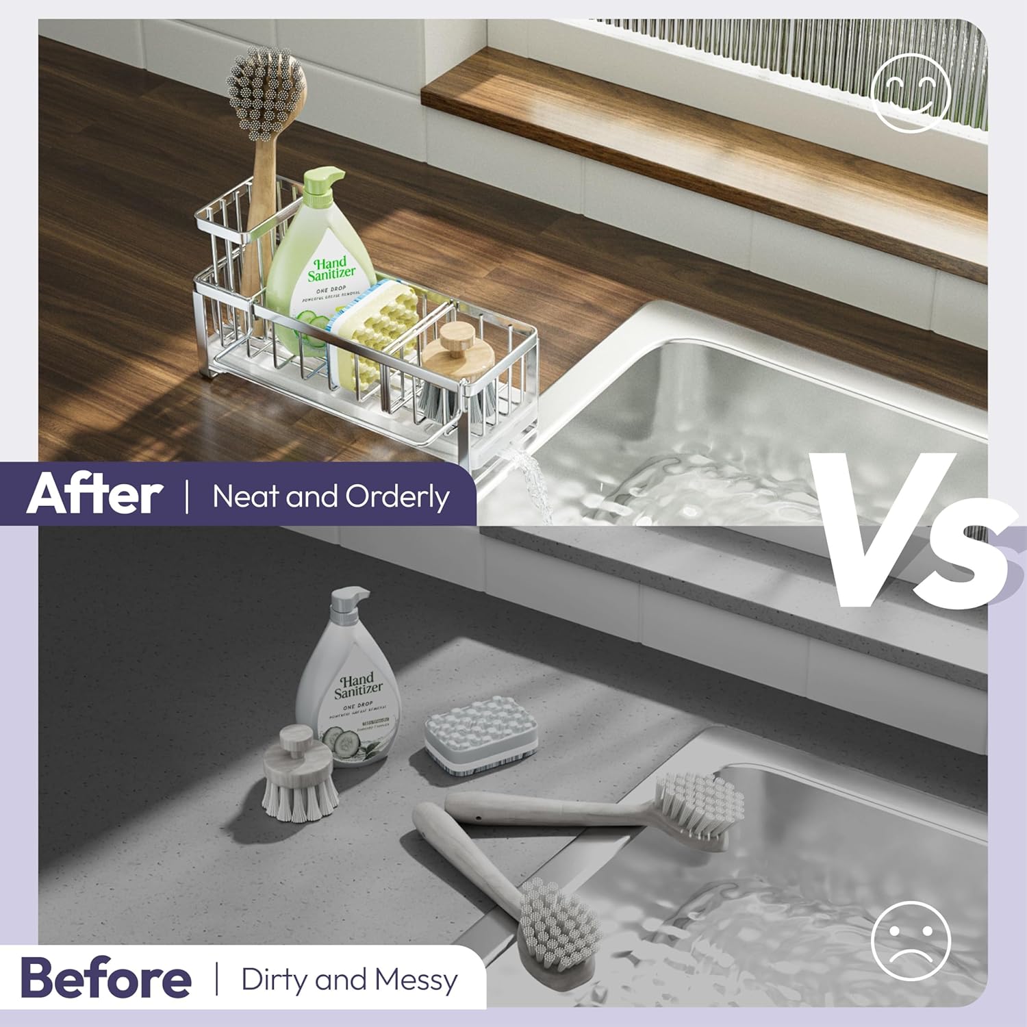 - [No Installation & Service]: Sink organizer sponge holder donβt require installation, you can use it when you recieve it. And you can reach out to us if you have any question about the kitchen countertop organizer, we will try our best to solve your problem in 48 hours
