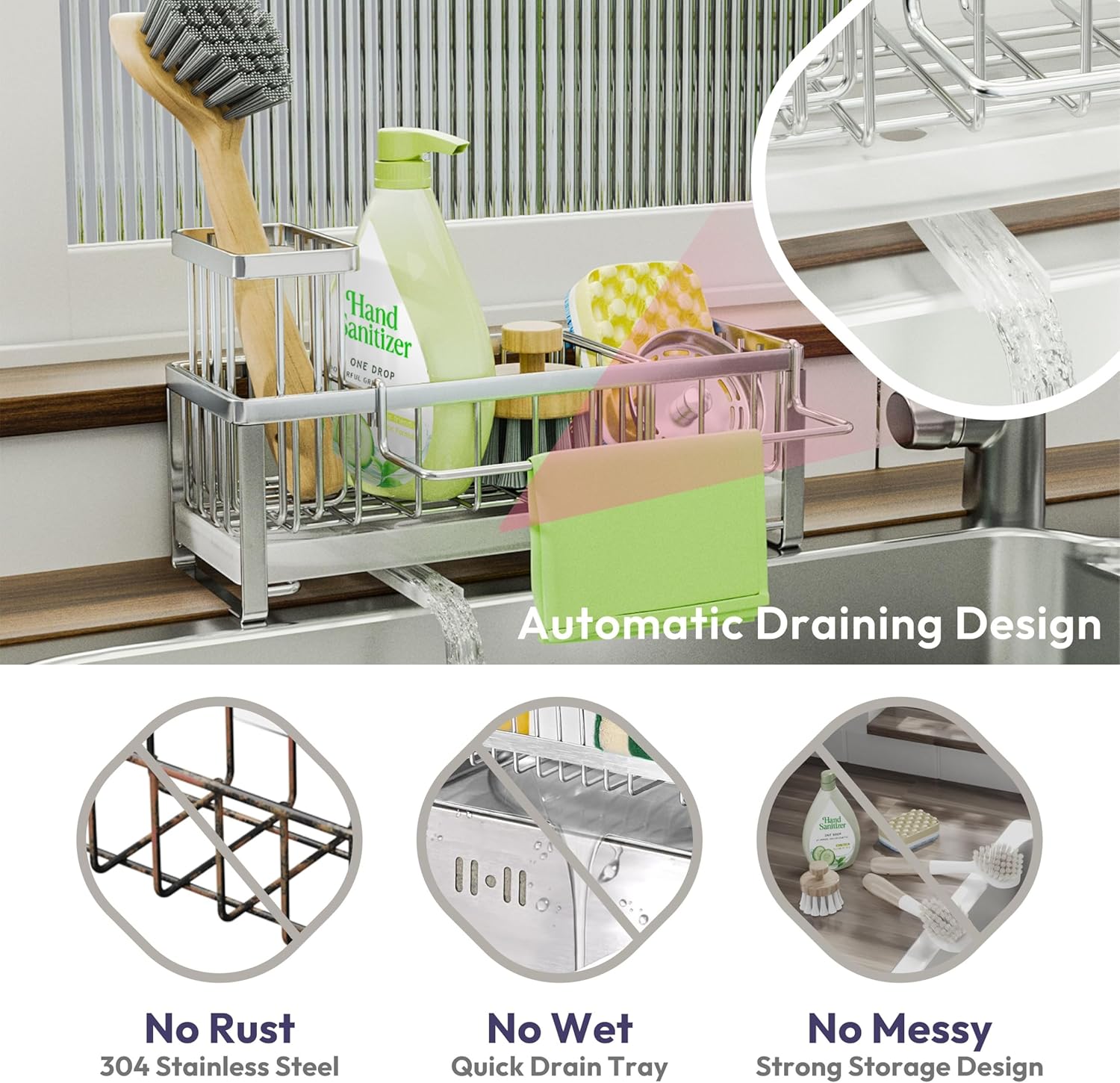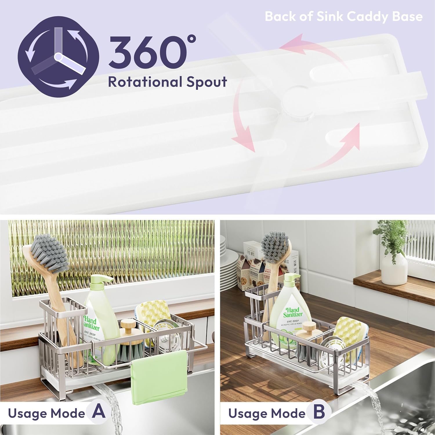 - [Automatic Draining]: Are you tired of cleaning the countertop?SWTYMIKI sponge holder for kitchen sink with 360Β° rotatable draining pipe can help you! Just put the sink caddy next to the sink, the water will drain automatically into the sink