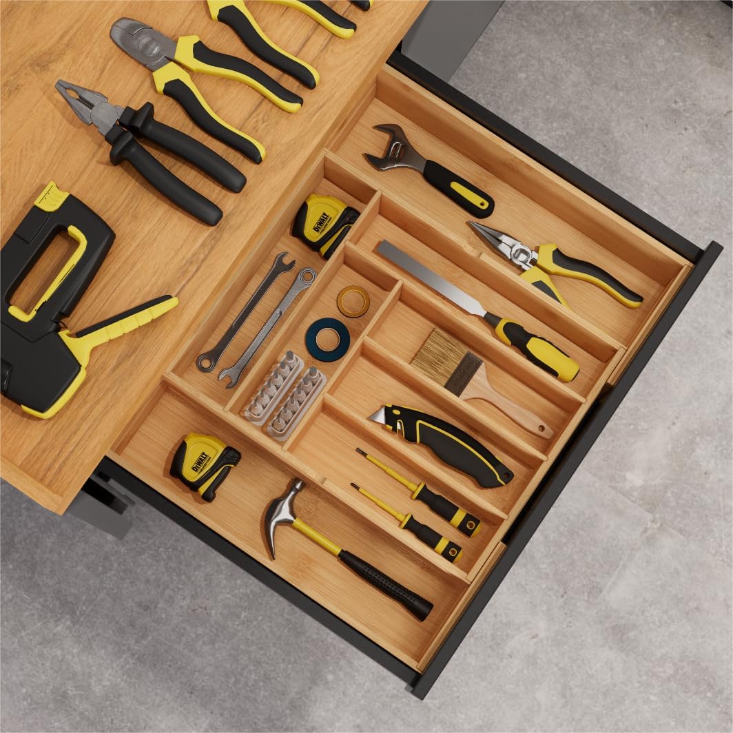 - Premium Tall Design: At 3.9 inches in depth, our bamboo drawer organizer offers greater storage capacity, providing ample space for a variety of utensils, tools, and accessories, ensuring everything stays organized and within easy reach. 12.52–22.64 W x 16.1 D x 3.94 H inches. Please measure your drawer height (>3.94 in) and width (>12.6 in) before ordering