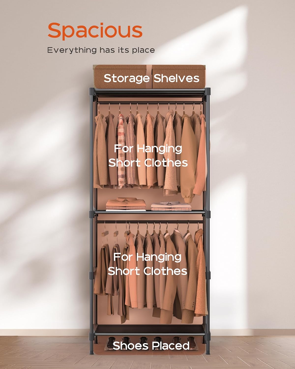 - [Versatile Storage Areas] This closet has 2 areas for hanging short clothes and shelves for folded clothes. The top area of the wardrobe can holds storage boxes, bags and other items, and the space under the bottom shelf for shoes; maximize your storage needs.