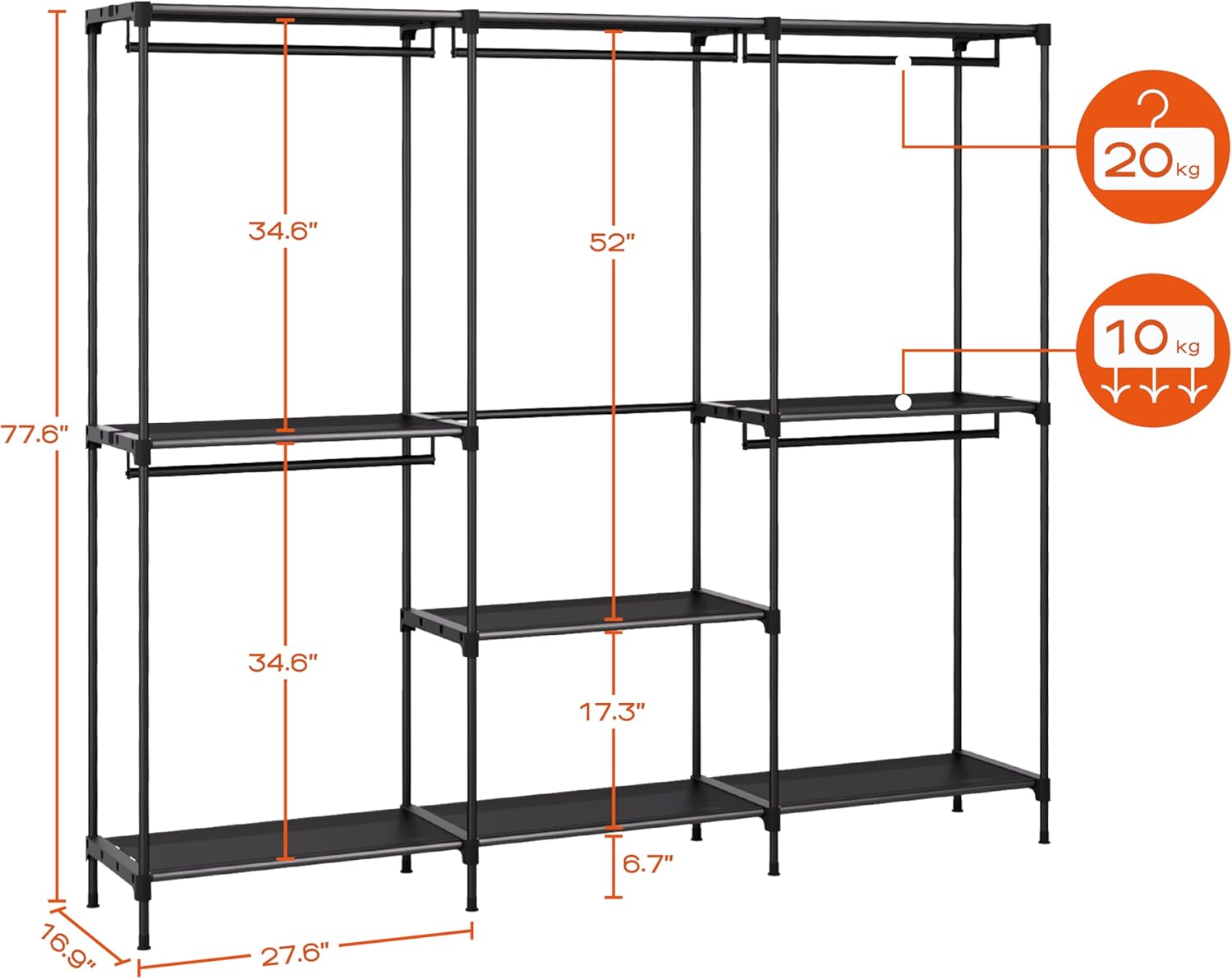- [Stable and Strong] Featuring with steel tubing, high quality non-woven fabric and durable connectors, this wardrobe ensures long-lasting stability and support. Each hanging rod holds 44 lb and Each shelf holds up to 22 lb.