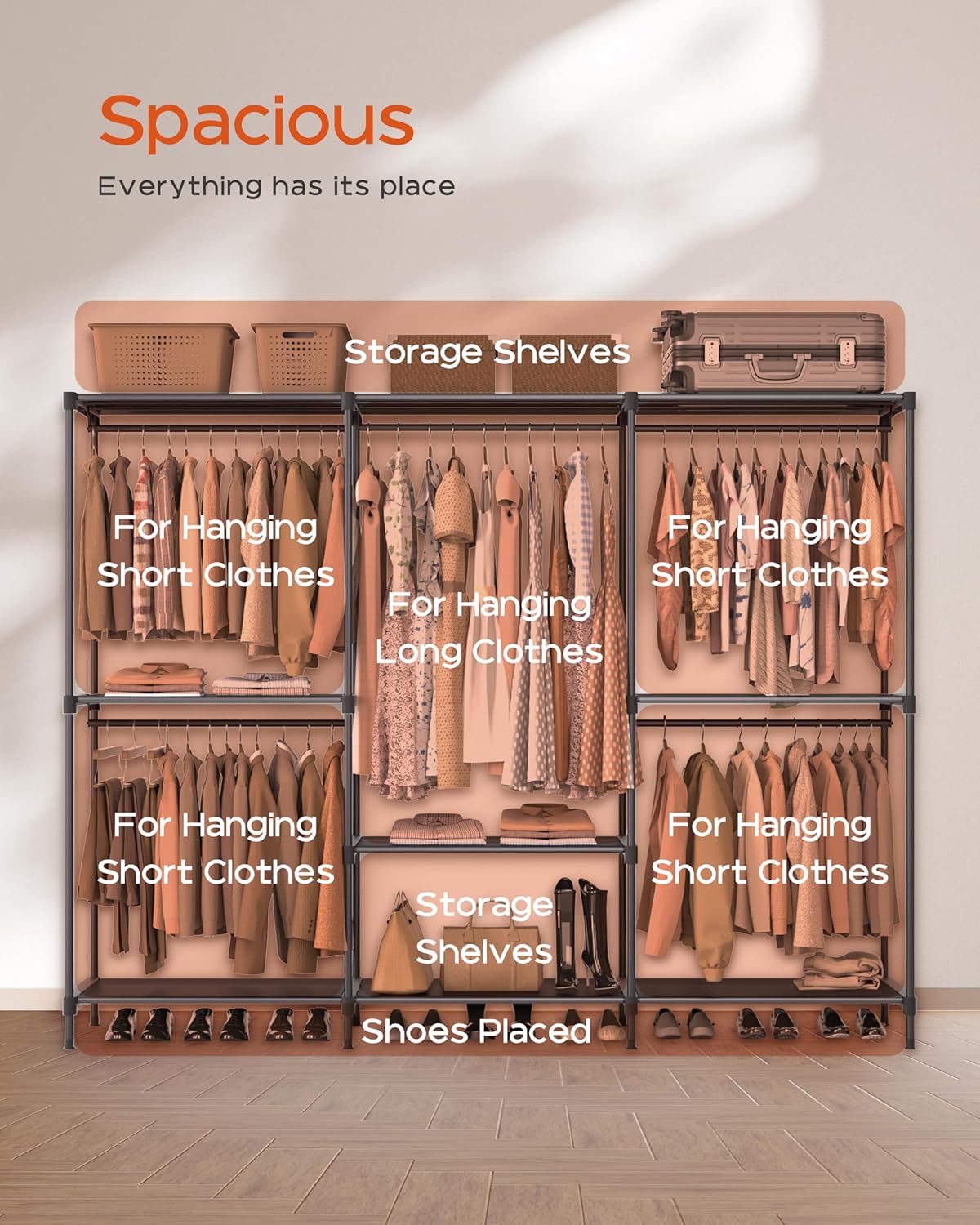- [Versatile Storage Areas] This closet has 4 areas for hanging short clothes and 1 area for hanging long clothes, as well as multiple shelves for folded clothes. The top area of the wardrobe can holds storage boxes, bags and other items, and the space under the bottom shelf for shoes; maximize your storage needs.