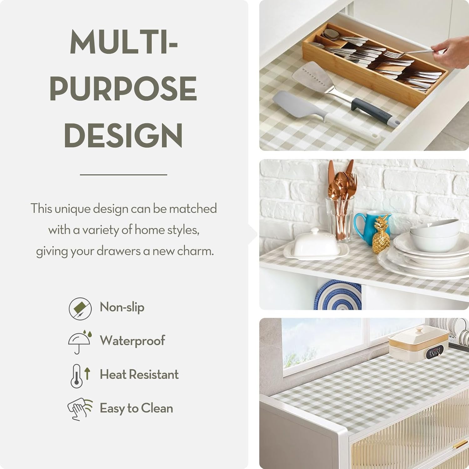 - ăWaterproof and Easy to CleanăDrawer Liner: The shelf liners we provide offer exceptional water and oil resistance, effectively safeguarding furniture against unsightly stains. They are effortlessly wipeable, ensuring that shelves and cabinets remain consistently clean and dry