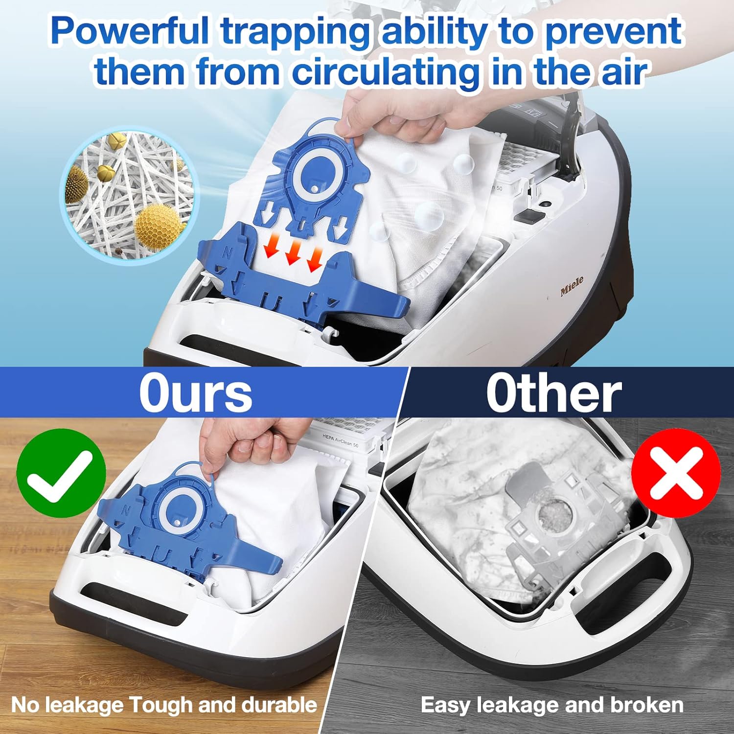 - Good Airflow Guidance]- Rowhalf AirClean 3D Efficiency Dust Bag with soft structure technology, air can easily pass through the bag, allowing your Miele vacuum cleaner to maintain efficiency at low suction settings. Effective in blocking over 99.97% of dust and 0.3 micron particles and other debris, improving the air quality in your home.