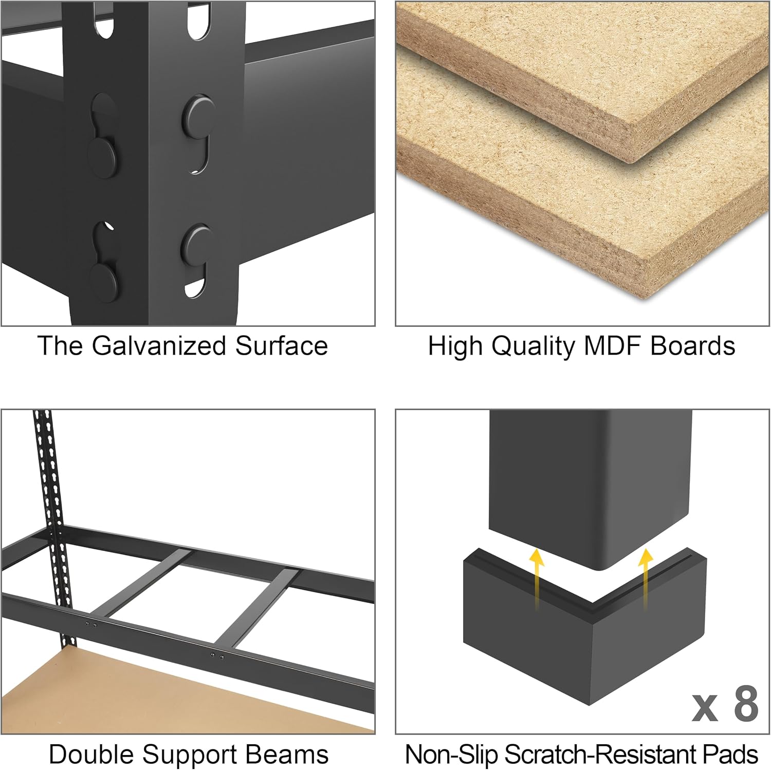 - ăHEAVY DUTY & LONG-LASTINGă : This 5-tier garage shelving is made of high-quality 0.24" thicker MDF boards and 0.04" thicker heavy duty galvanized metal frame, sturdy and enduring. The metal frame is covered with premium powder coating to give it a smooth surface. Each layer shelf add 2 middle support beam for more weight capacity. Each shelf holds up to 450 lbs, 5 tier shelves' total max load weight is 2250 lbs
