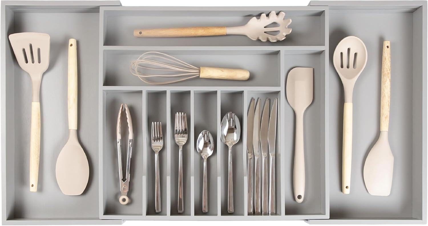 - MAXIMIZE YOUR DRAWERβS STORAGE CAPACITY: This 11-compartment (9 fixed + 2 adjustable) gray organizer measures 17.25β long x 2.7β tall and expands from 18β to 33β wide (and any width in between). Most other flatware organizers expand to 22β or 23β wide and are only 2β tall. Itβs amazing how much storage capacity an extra 0.7β in height adds when filling your organizer full of flatware and utensils!