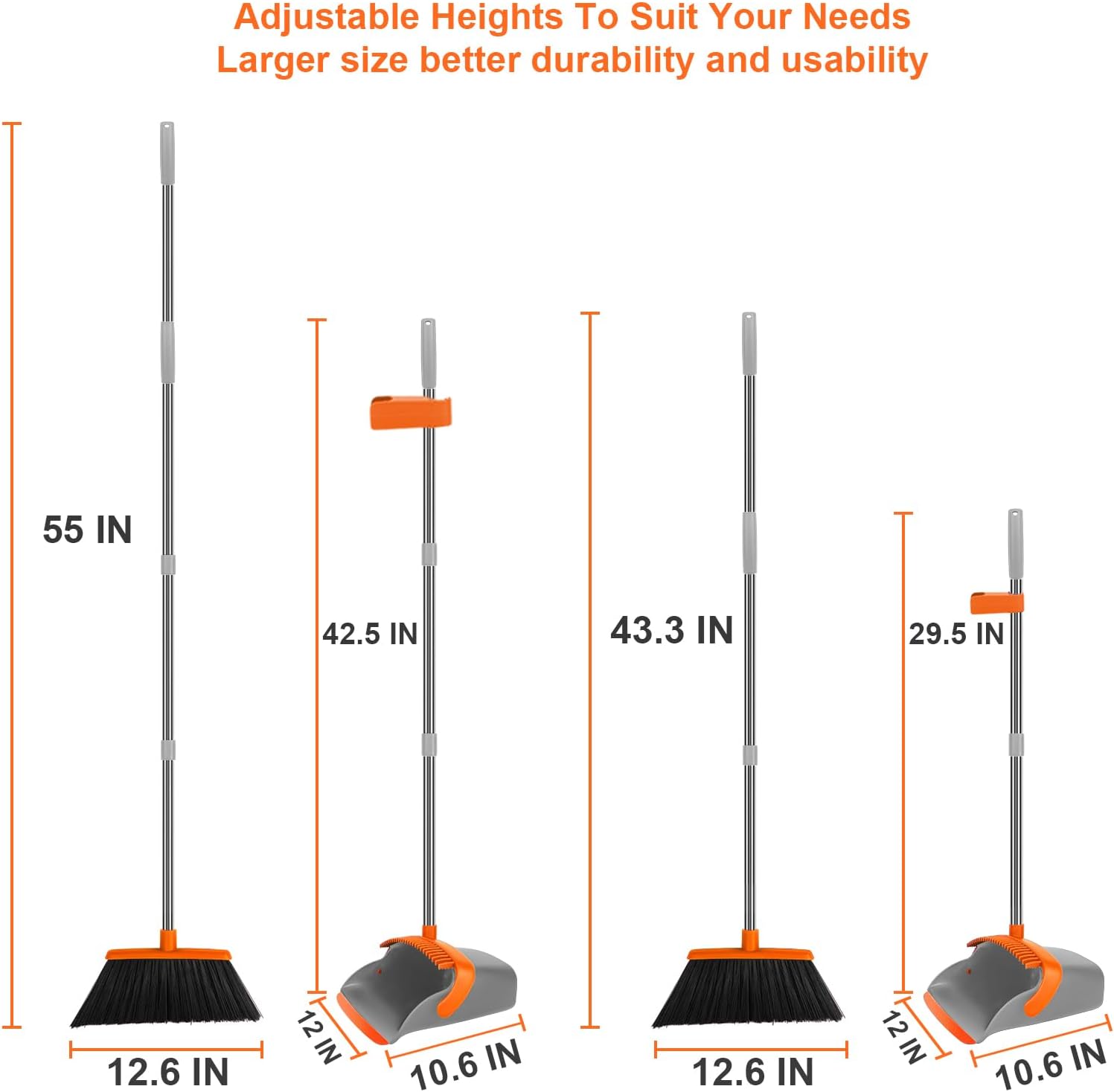 - Convenient Long handle Dustpan and Broom Set: Bid farewell to backaches with the 55" long broom handle and the 42.5" long-handled dustpan, creating a long-reaching solution for effortless cleaning. The 12.6-inch wide angle broom makes cleaning a breeze, offering versatility in tackling various messes.
