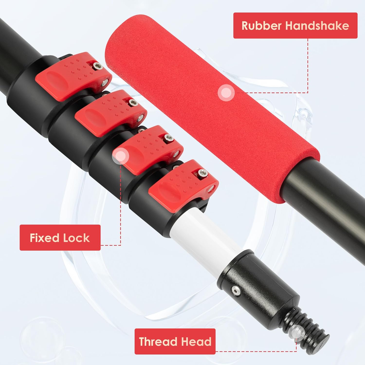 - Freely Adjustable Length: 4-stage adjustable extendable pole with lock buttons, easily extend telescopic rod to desired length and secure pole with the lock buttons, 30 feet high reach to clean spider webs up to 2nd floor outdoor.