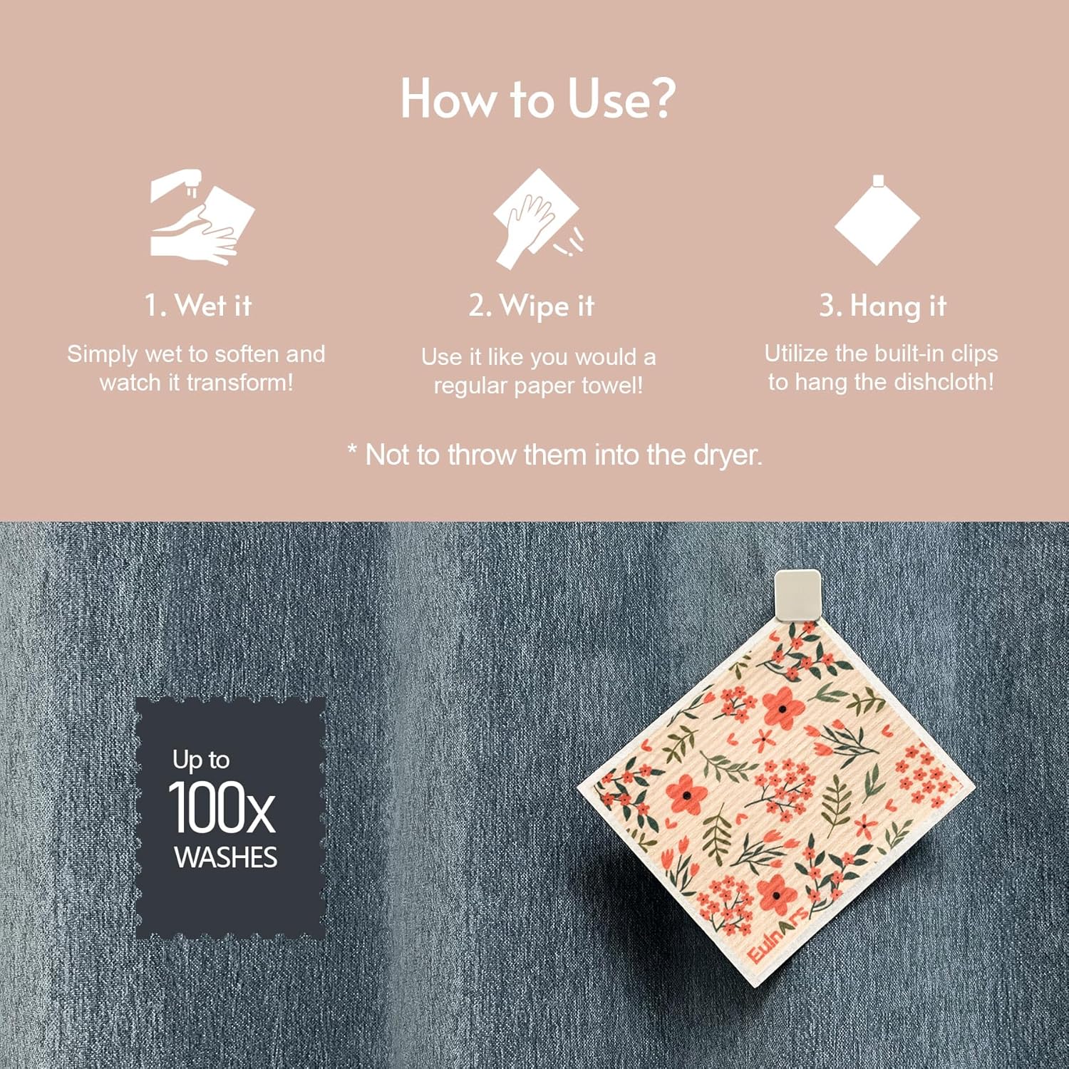 - Easy to Clean and Store: Our swedish dish cloths, measuring 7.8 x 6.8 inches, each set comes with 8 dish cloths in 4 styles, along with 2 self-adhesive clips, 1 magnetic clip, and 9 labeling tags. Customize storage for easy access, hanging them on walls, counters, or refrigerators to keep your kitchen organized