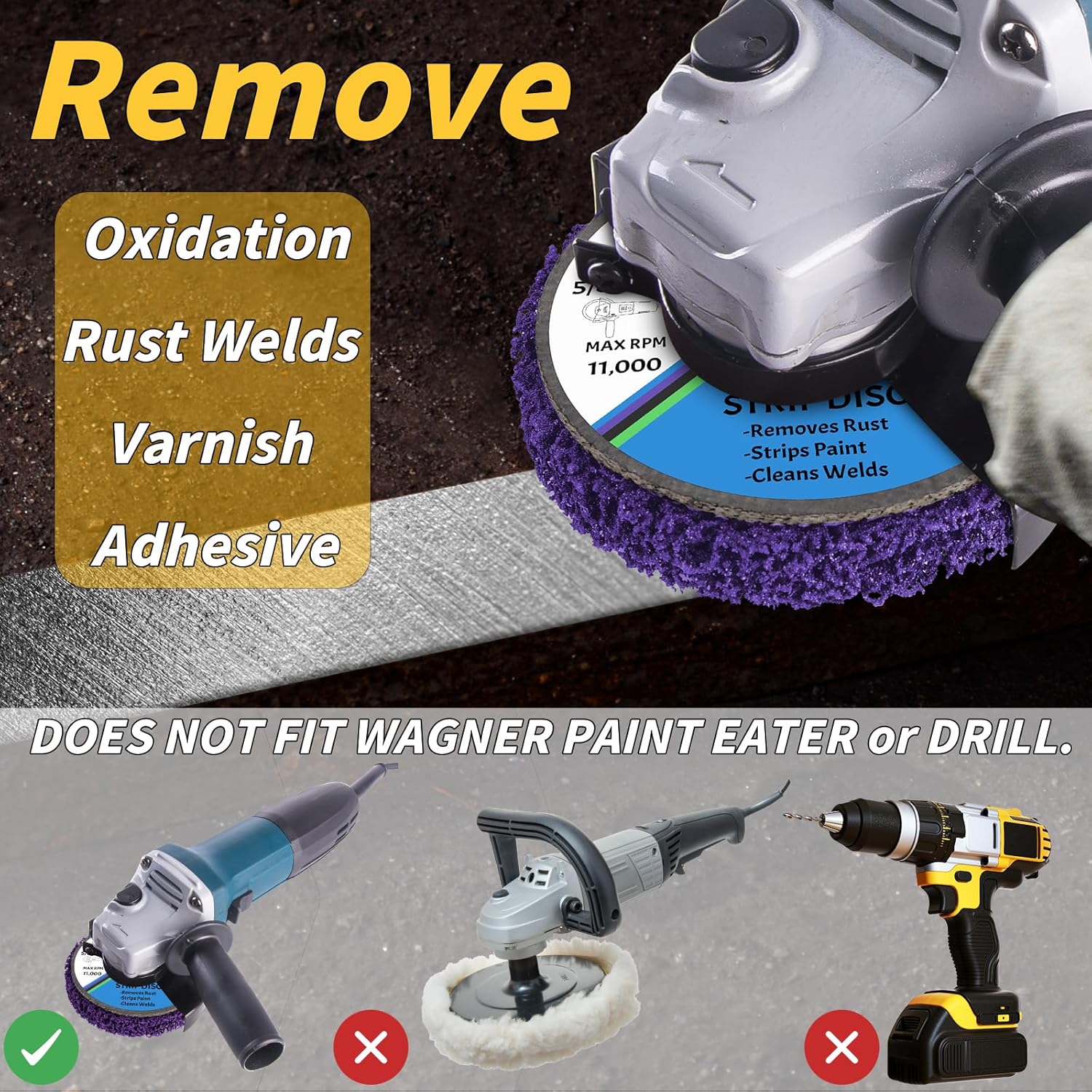 - 4" x 5/8" Strip Discs Bulk: The package includes 20x purple Paint Stripping Discand. our 4" x 5/8" strip discs effortlessly remove paint, rust, and oxidation, ensuring a smooth finish without damaging surfaces. Please be sure to wear a mask when using the strip disc to prevent inhalation of dust. We recommend that you wear gloves when using it