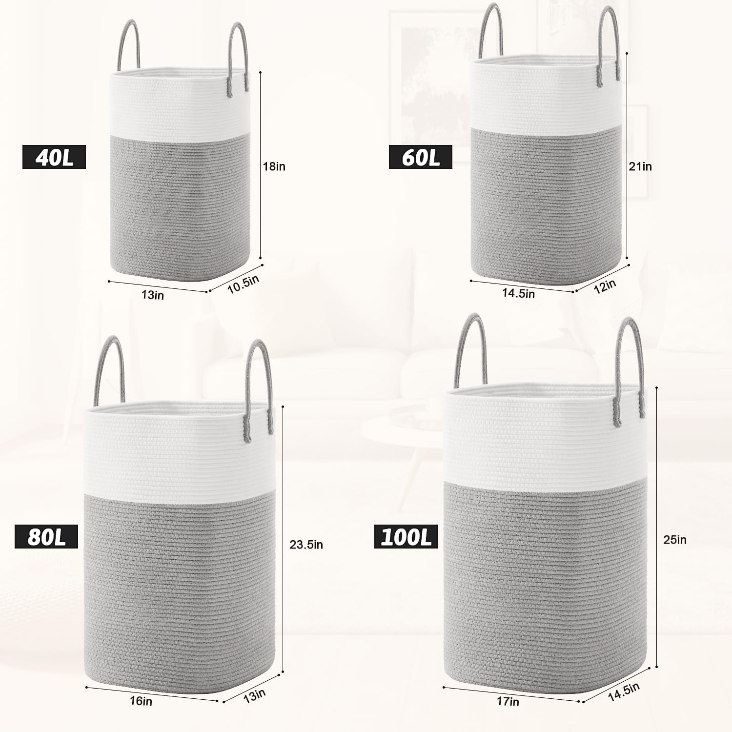 Laundry Basket,Woven Cotton Rope Laundry Hamper,Versatile Storage for Dirty Clothes,Baby Toys,and Blankets in Bathroom, Nursery,and Living Room (Grey, 100L)