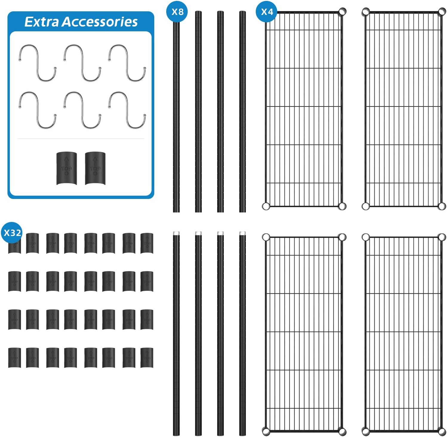 - What You Will Get: This Wire Shelving include: 4 pieces of Metal Mesh Board, 4 pcs Upper Pole,4 pcs Bottom Pole, 32 pcs Clips; Additionally, an additional 2 clips and 6 metal hooks are included