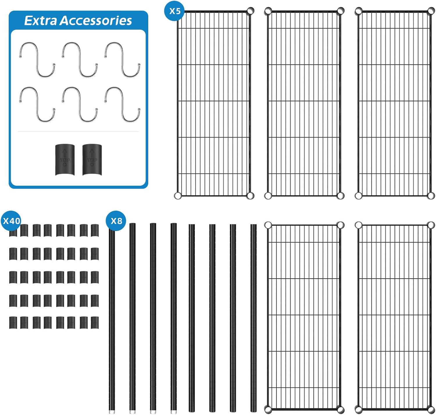 - What You Will Get: This Wire Shelving include: 5 pieces of Metal Mesh Board, 4 pcs Upper Pole,4 pcs Bottom Pole, 40 pcs Clips; Additionally, an additional 2 clips and 6 metal hooks are included