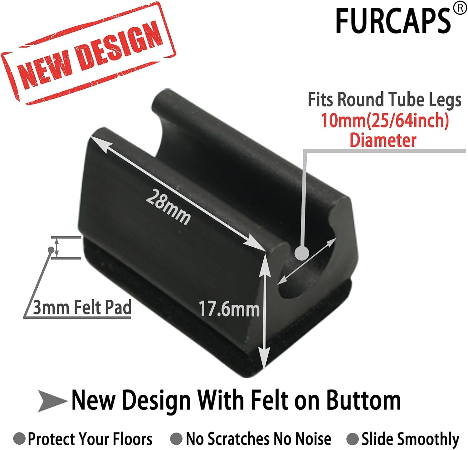 - Fit to Metal Tubular Legs: FURCAPS plastic chair foot u shaped floor glides fit round tube furniture legs.MEASURE leg size before purchase to save time! Recommended Size:Tubular Legs Diameter 10mm(25/64inch).Please watch video for how to measure chair leg and slect correct size