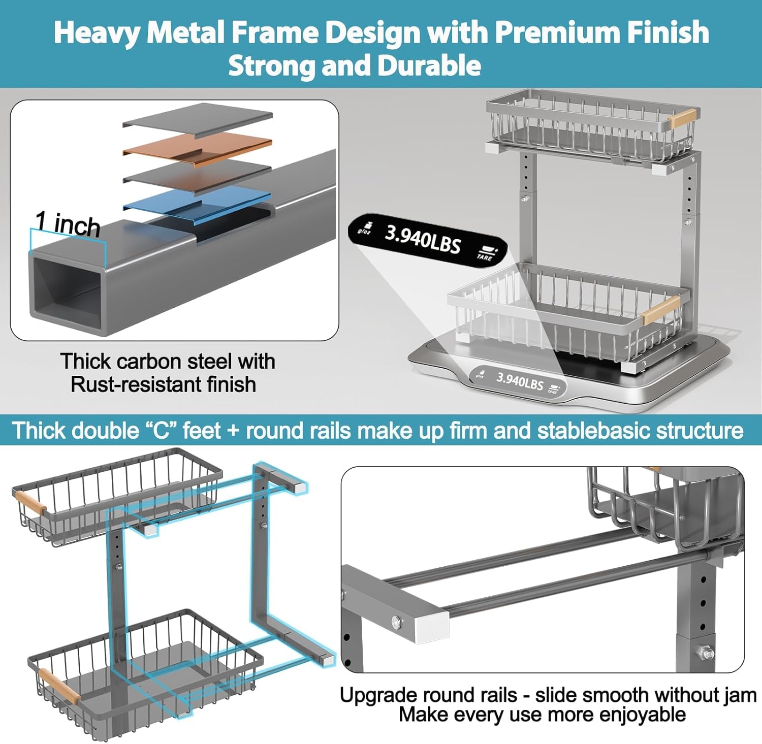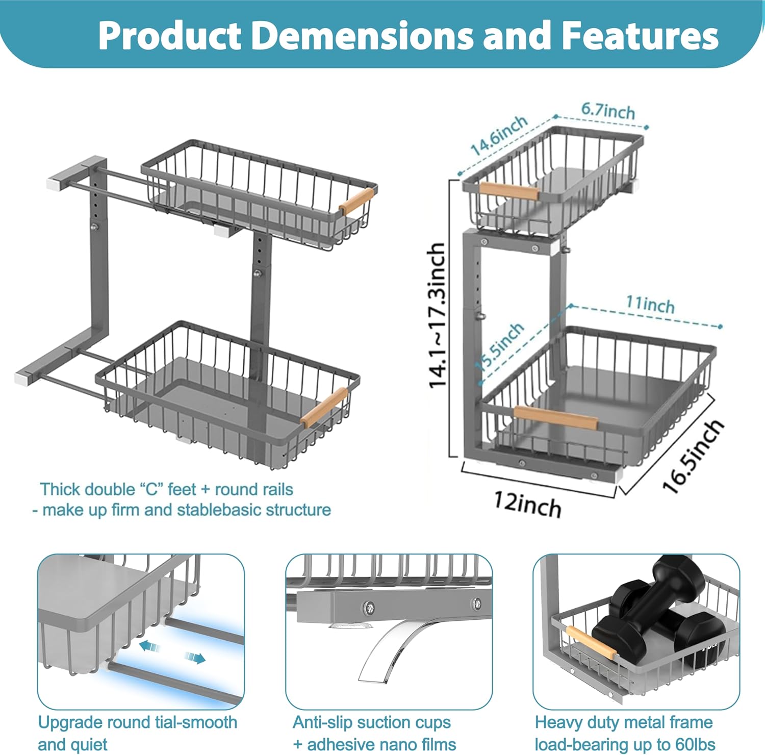 - 2 Tier Pull Out Baskets: Liuoud under sink shelves adopt upgraded round rails that slides out smoothly without jams or noise. Both Upper and lower drawers can slide out, which is perfect for accessing items deep in lower cabinet