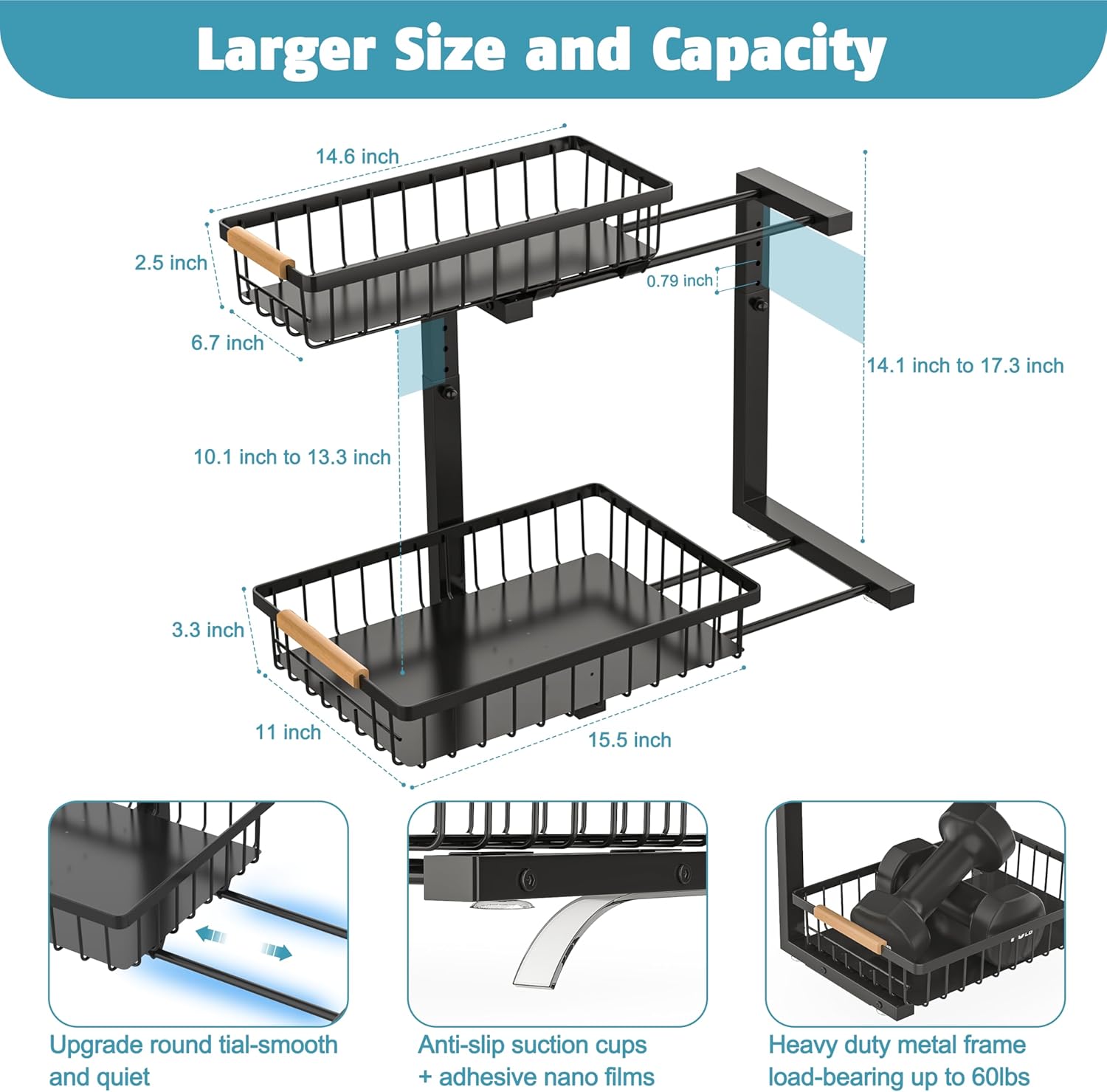 - 【Larger Size and Storage Capacity】Liuoud upgraded under sink pull out organizer with larger size to other with more storage space. The upper basket measured 14.6”×6.7”×2.5”, the lower basket measured 11”×15”×23.3”, the lower height range is 10.1”~13.3” .
