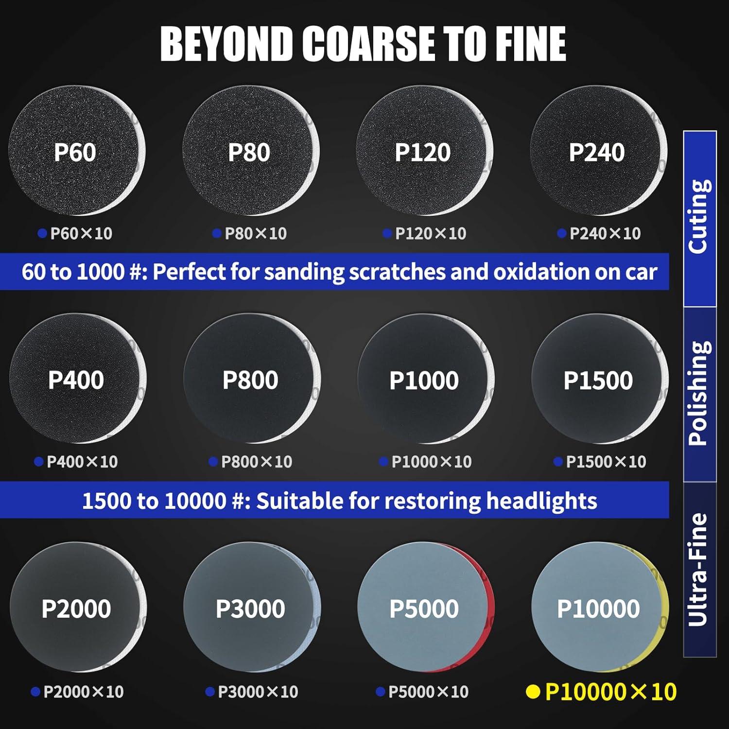 - Full-Cycle Sanding Support - The car drill polishing kit featuring 3 inch sanding discs range 60/80/120/240/400/800/1000/1500/2000/3000/5000/10000 grit sandpaper for dry and wet use, with orbital sander pads, imitation wool buffing pad, and upgraded backing pads for 1/4 and 1/8 inch shank. Seamlessly transition from sanding to polishing.