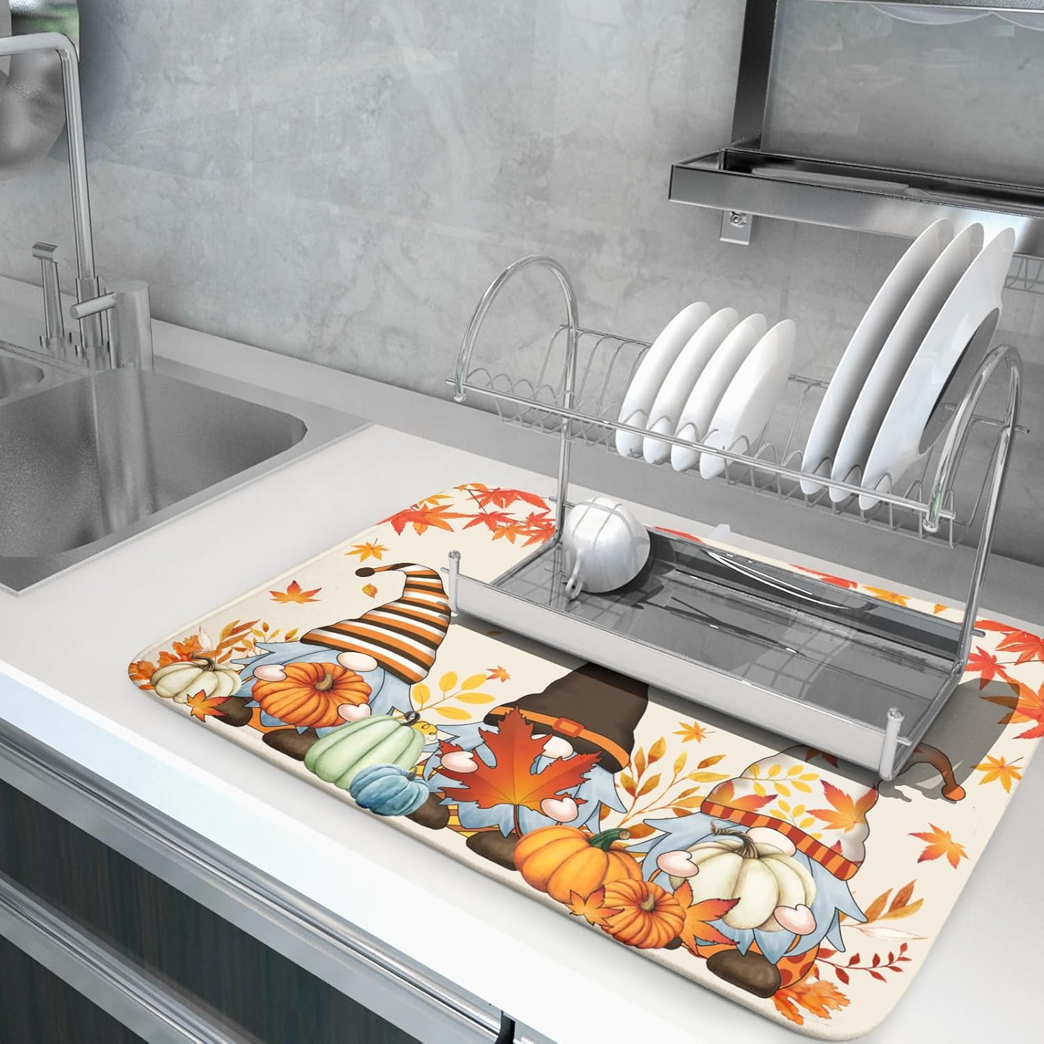 Fall Gnome Dish Drying Mat for Kitchen Counter Fall Pumpkin Dish Drying Mat Absorbent Fast Dry Drying Mat 16x18 Inch Thanksgiving Day Maple Leaves Dishes Pad Dish Drainer Rack Mats Fall Decor