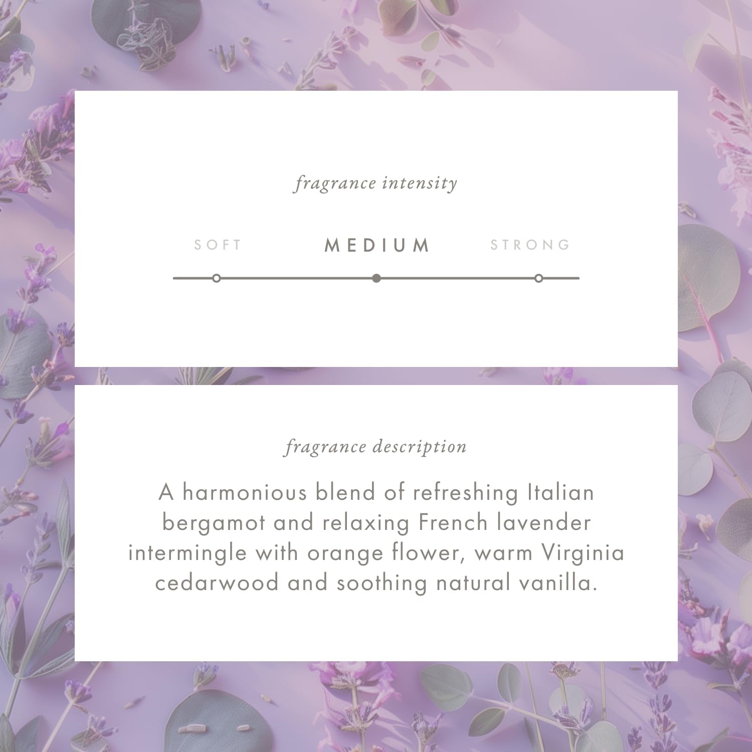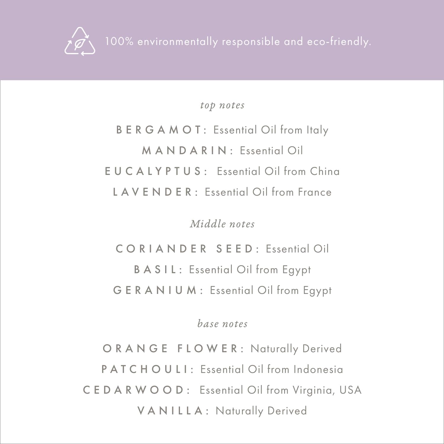 - ECO SERENITY: Experience refreshing Italian bergamot and calming French lavender, accented by sweet orange flower, warm Virginia cedarwood, and soothing natural vanilla. This harmonious scent exudes both elegance and tranquility.