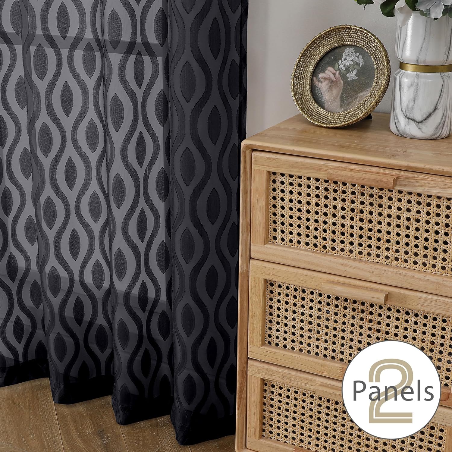 Aiyufeng Black Sheer Curtains Tiers 36 Inch Length 2 Panels Set, Airy Lightweight Clip Jacquard Small Window Curtains, Modern Wavy Line Textured Voile Sheer Curtains for Small Windows, 40"Wx36"L Inch