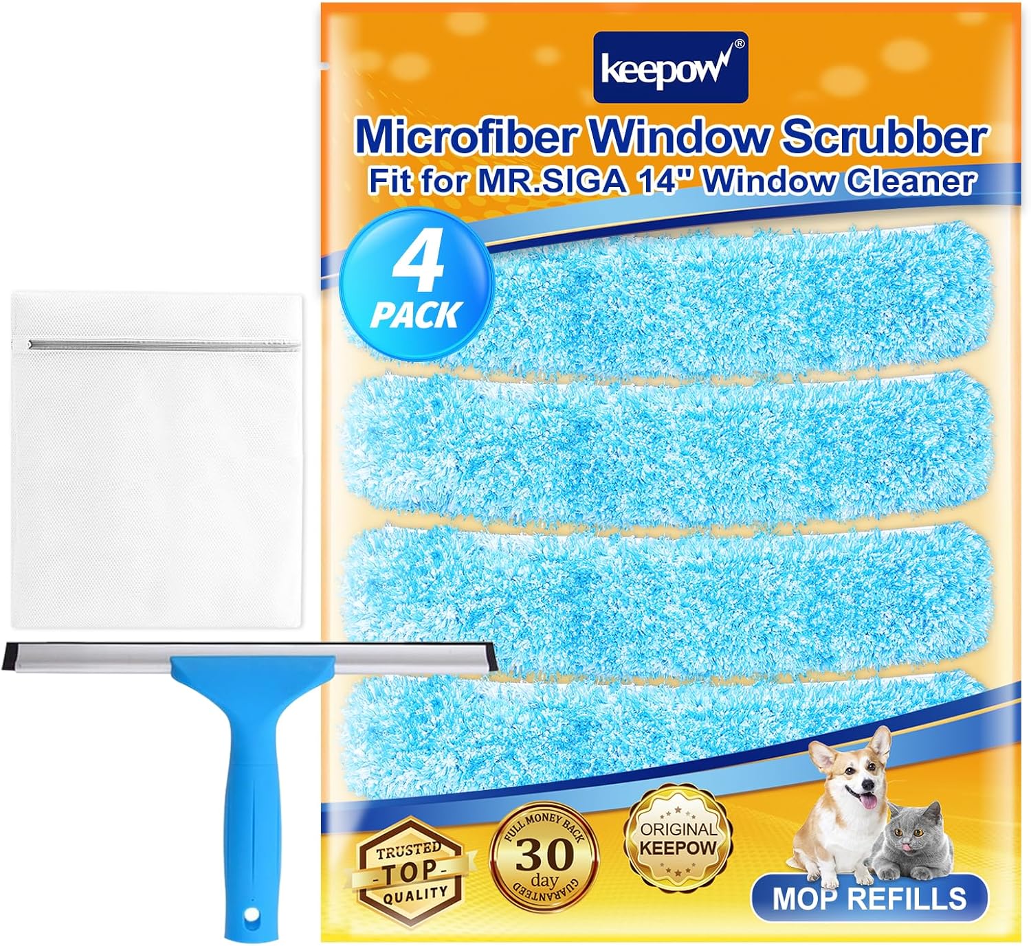 KEEPOW 14" Microfiber Window Scrubber Refill Replacement Compatible with MR.SIGA, Compatible with Ettore Professional Window Cleaning, Reusable & Washable Window Squeegee for Home (4 Pack)
