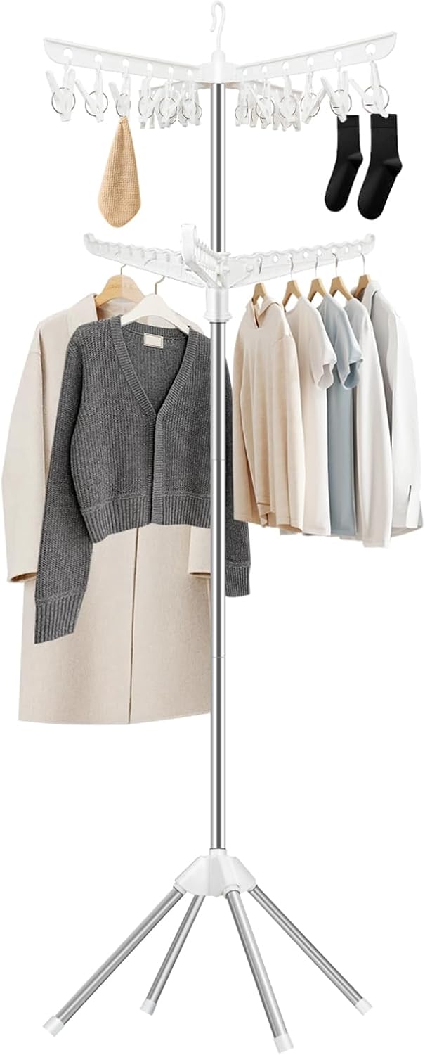 SUYU Clothes Drying Rack,Folding Clothes Drying Tree, 2 Layer with 24 Clips and 3 Rotatable Arms,66.9-Inch Indoor Clothes Rack,Stainless Steel,4 Legs,White and Silver SNJ102
