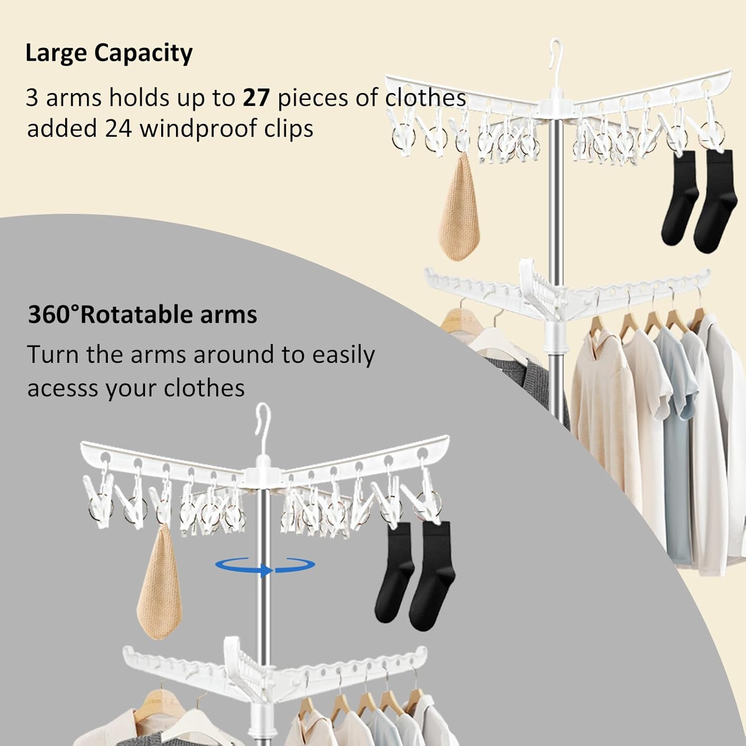 - [Efficient Drying & Storage]The SUYU Drying Rack boasts a dual-tier design with 24 upper clips and 3 hanging arms, featuring 27 hanging holes for a variety of garments, ensuring efficient drying and organized storage for all your clothes and accessories.