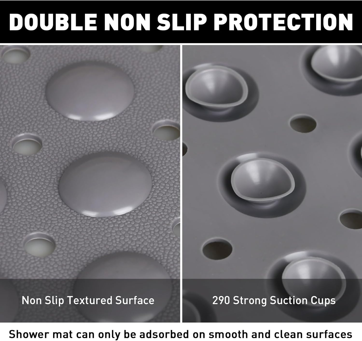 - SUPER NON SLIP: Our shower mat has a delicate anti-slip texture on the surface and 290 suction cups on the back, which can be firmly adsorbed on the floor. Note: To prevent slipping, do not use shower oils. Shower mats can only be adsorbed on smooth and clean surfaces