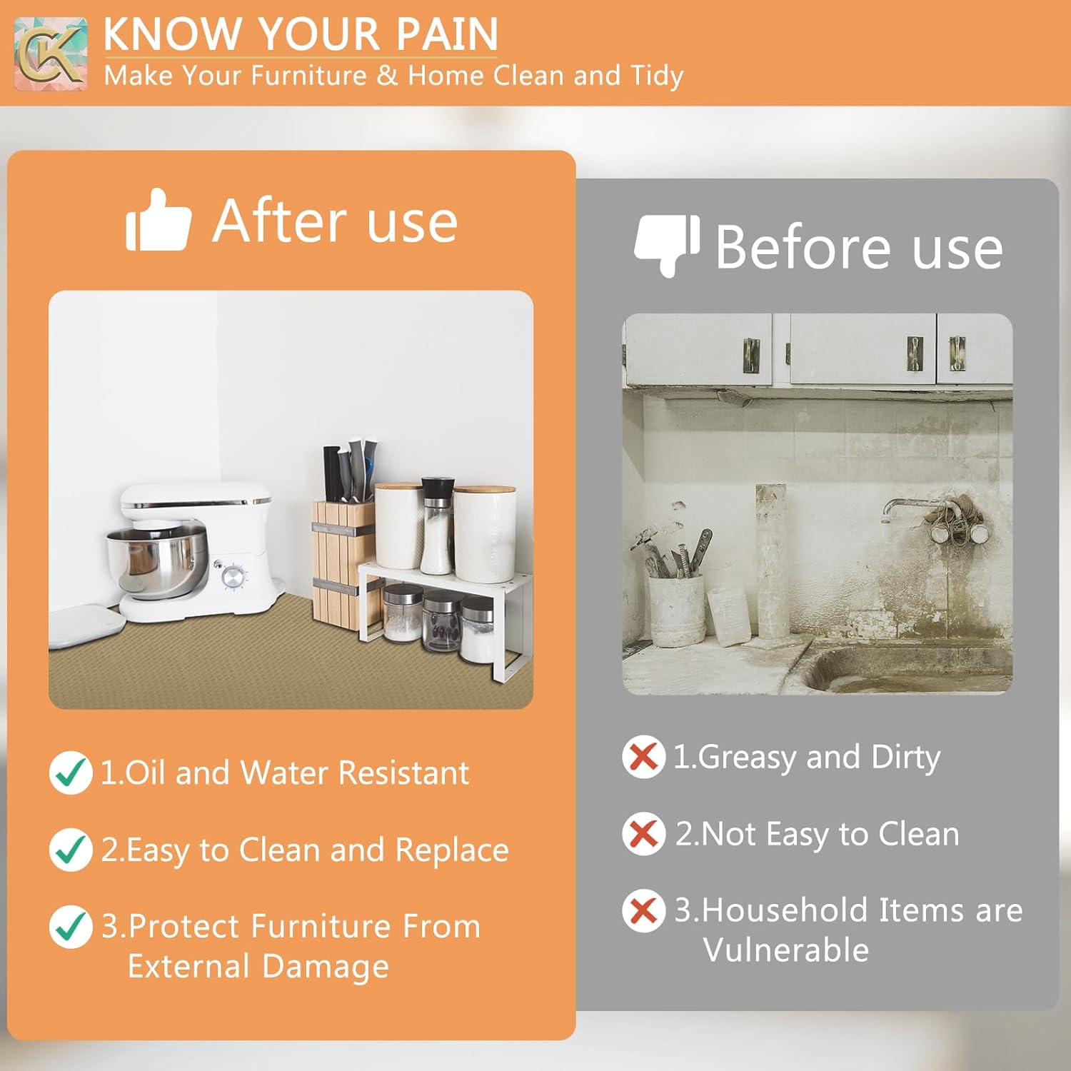 - 🍀Non-Slip And Waterproof: Shelf liners have a textured and grip-enhanced surface that helps keep items in place, preventing them from sliding or shifting. The adhesive-backed kitchen mat has waterproof properties, which can prevent water from penetrating under the countertop and protect the countertop from liquid damage.