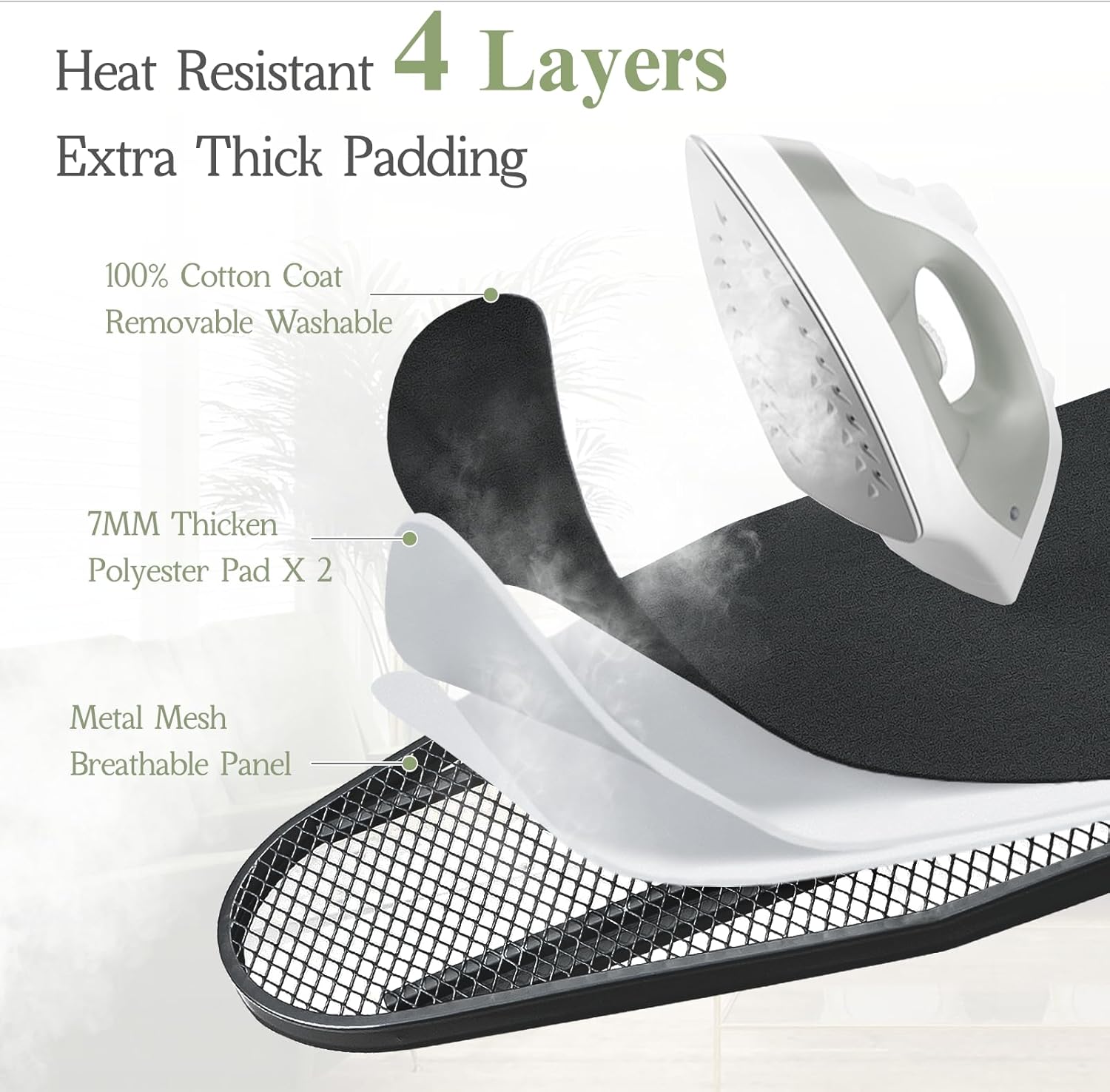 - Iron Board Cover: Heat-resistant ironing board cover with an ultra-thick, 2-layer cotton padding absorbs heat and creates an ideal ironing surface, enhancing the ironβs glide, making the task quicker and easier.