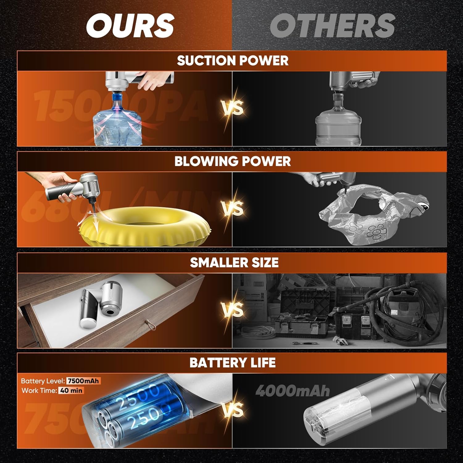 - ă17000PA Super SuctionăSaker handheld vacuum cleaner uses an upgraded high-speed brushless motor with 17000PA super suction. The three-speed suction adjustment achieves different suction powers of 7KPA-15kPA, and sand, dust and debris, pet hair, etc. can be easily cleaned.