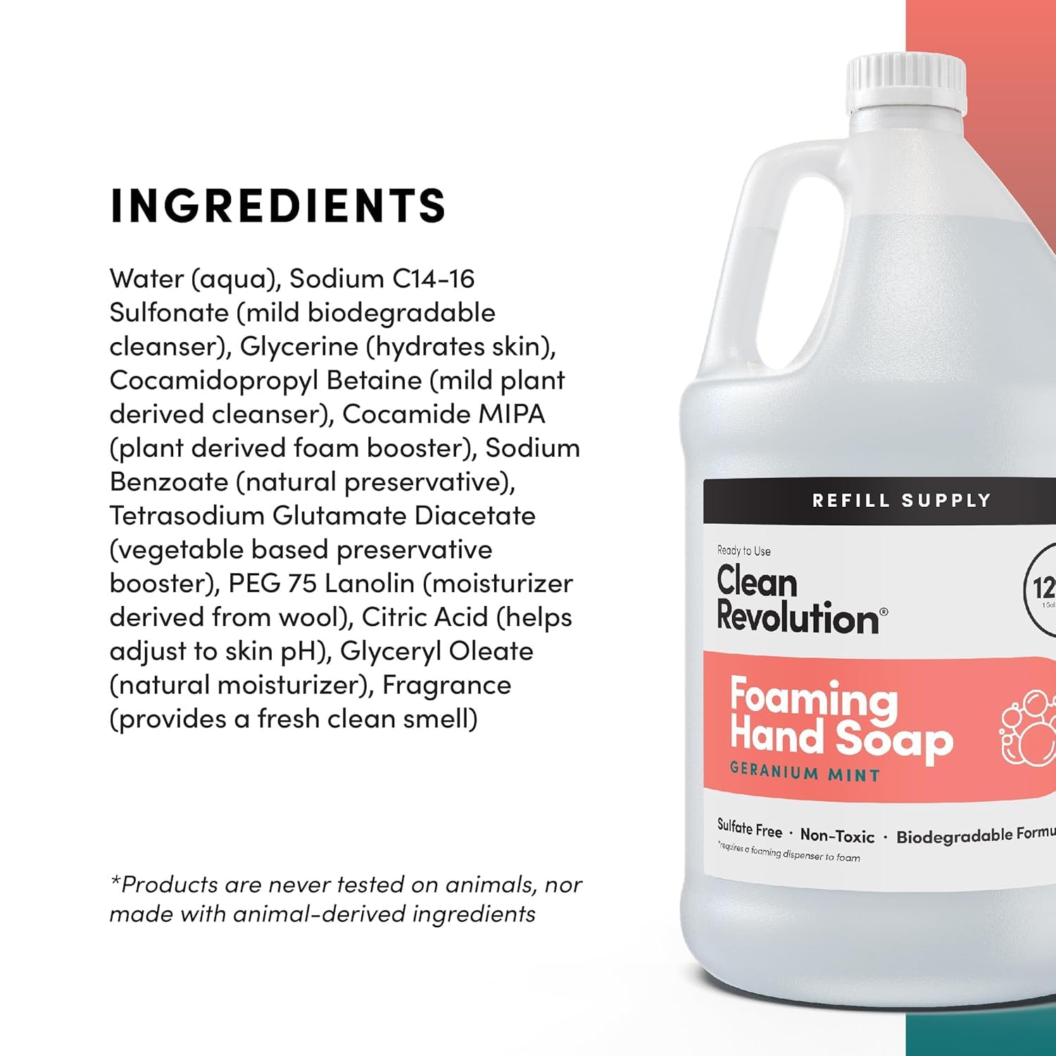 - REFILL & REUSE: Our Refill Supply container delivers exceptional value with 128 ounces of ready to use liquid foam soap designed to be used with Clean Revolution Refillable Foaming Hand Soap dispenser. This gallon jug has more than 8 refills, eliminating the need for individual single-use bottles and creating less plastic waste. Foaming Hand Soap dispenser sold separately.