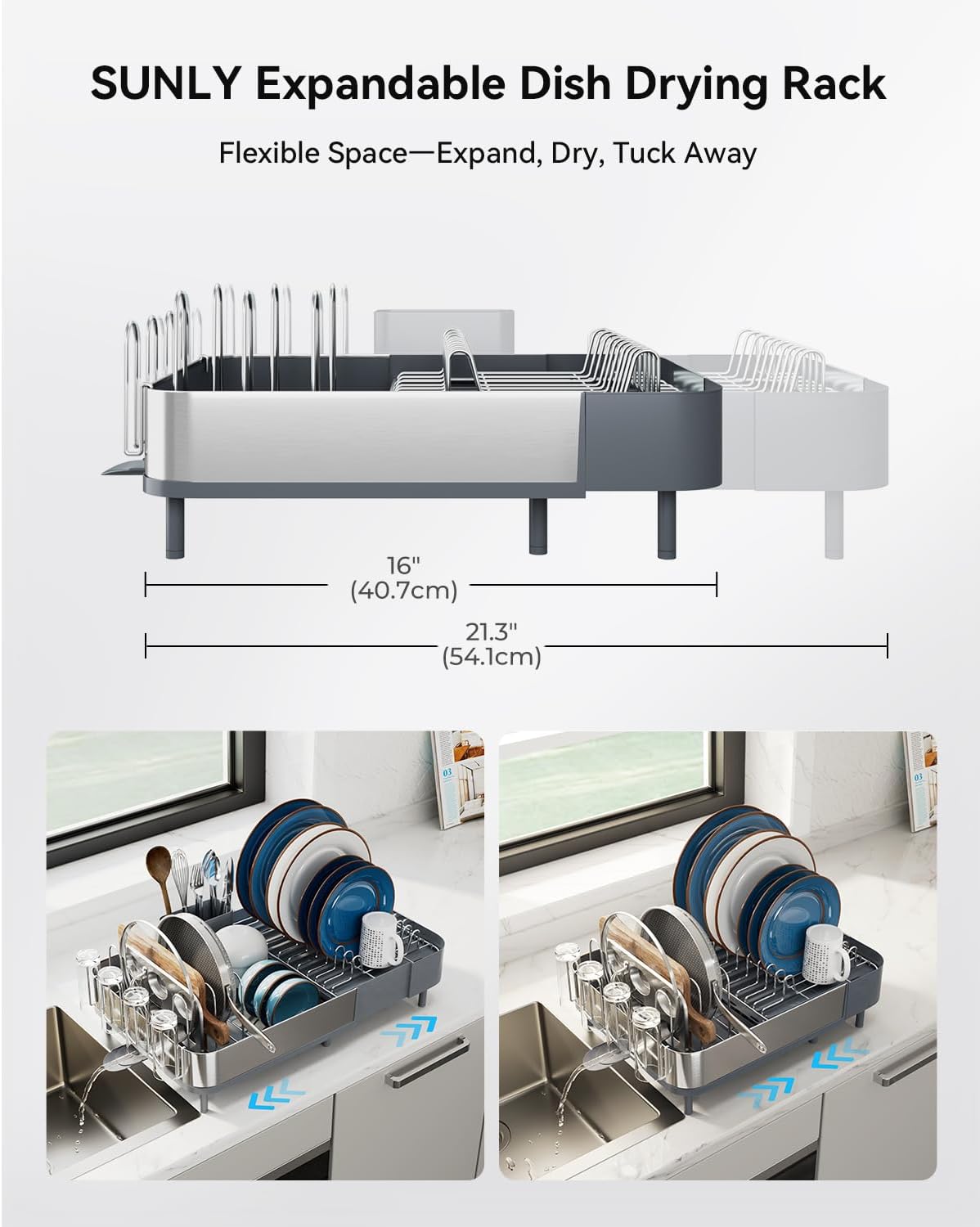 - [Expandable Design for Flexible Use]: Sunly expandable dish drying rack easily adjusts from 16β to 21.3β in length, giving you the flexibility to maximize drying space when needed, or keep it compact to save countertop space