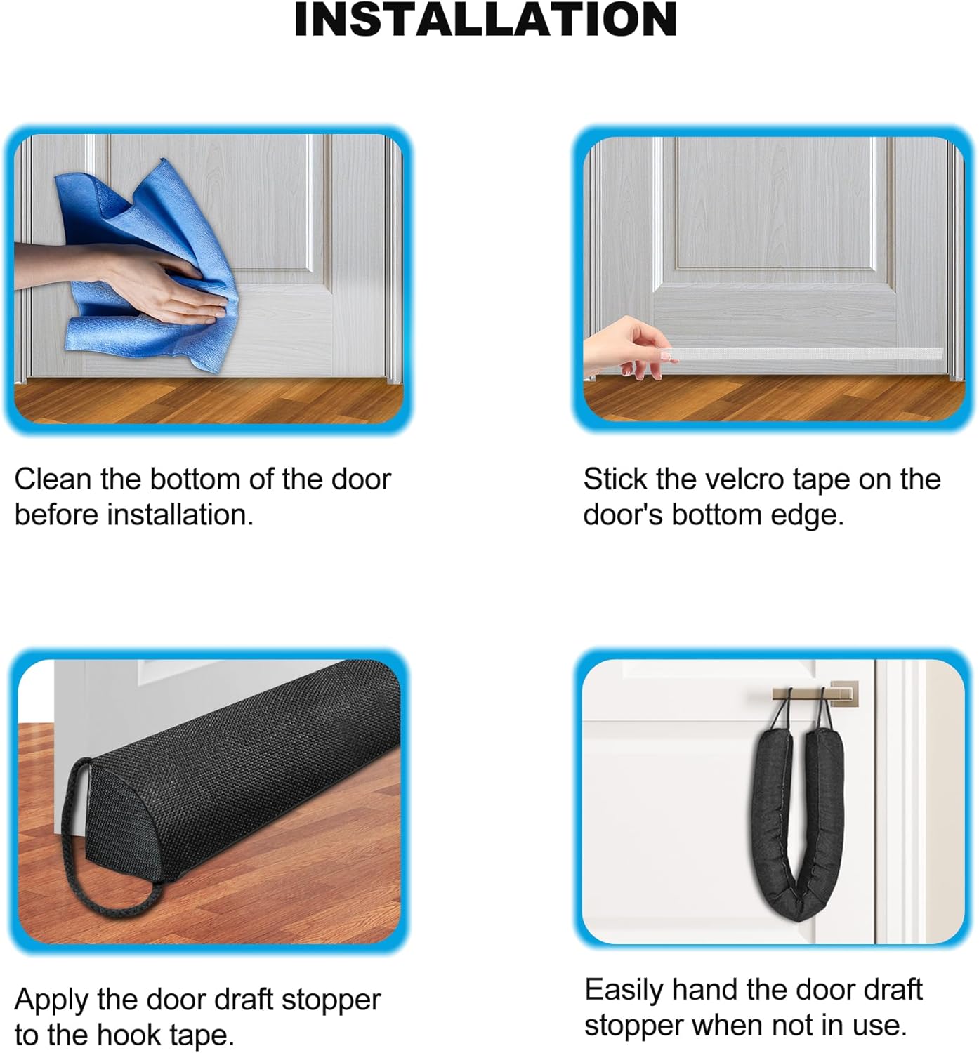 - Easy Installation & Storage - just apply the included hook loop strip to your door, then stick the door draft stopper. The weighted door draft stopper features a convenient hanging loop, which is convenient for you to hang in the closet, coat rack, or door handle when not in use.