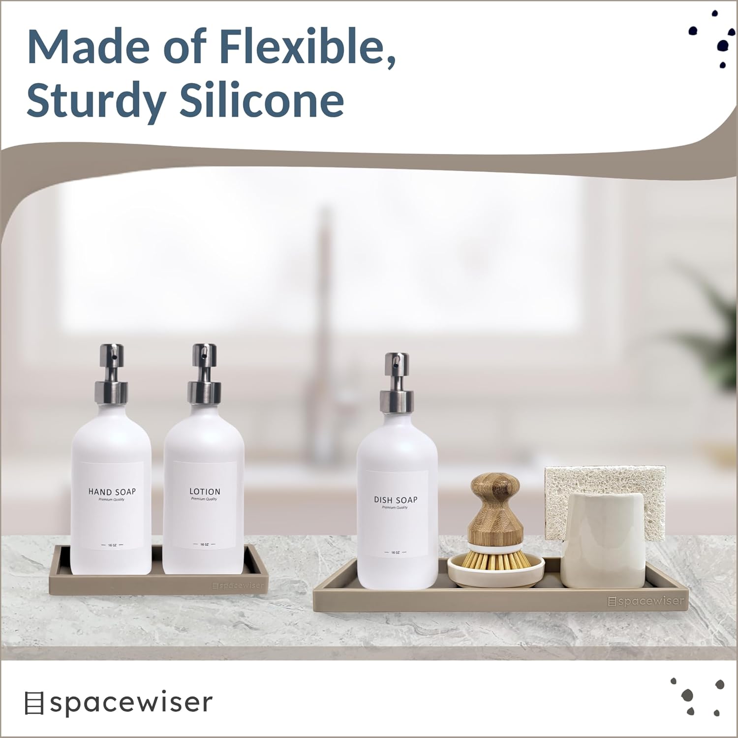 - Use Them Anywhere - Choose the endlessly useful and aesthetically pleasing trays that work anywhere. Spacewiser Original Silicone Trays are made of premium food grade silicone, without the addition of potentially unsafe thickening and hardening agents or chemicals. They’re shatterproof, waterproof, slip-resistant, heat resistant to 425F, and dishwasher safe. They’re the perfect silicone tray for kitchen counter, vanity tray, coastal bathroom tray or kitchen soap tray.