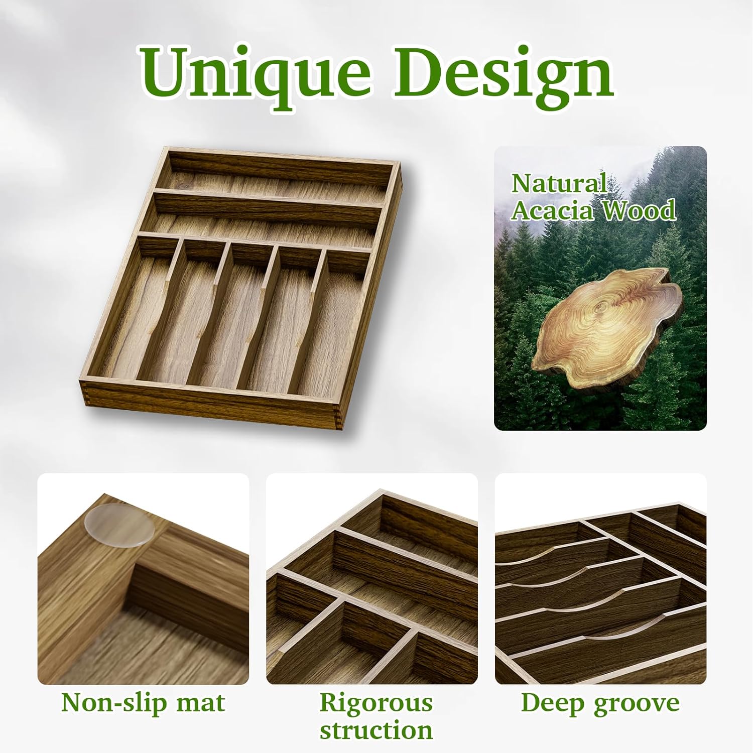 - šššš®š«šš„ ššššš¢š ššØšØš-Made of acacia wood, this silverware drawer organizer is very attractive, well made and easy to clean. More resistant than plastic and other materials. The color of natural wood is so beautiful and rich.
