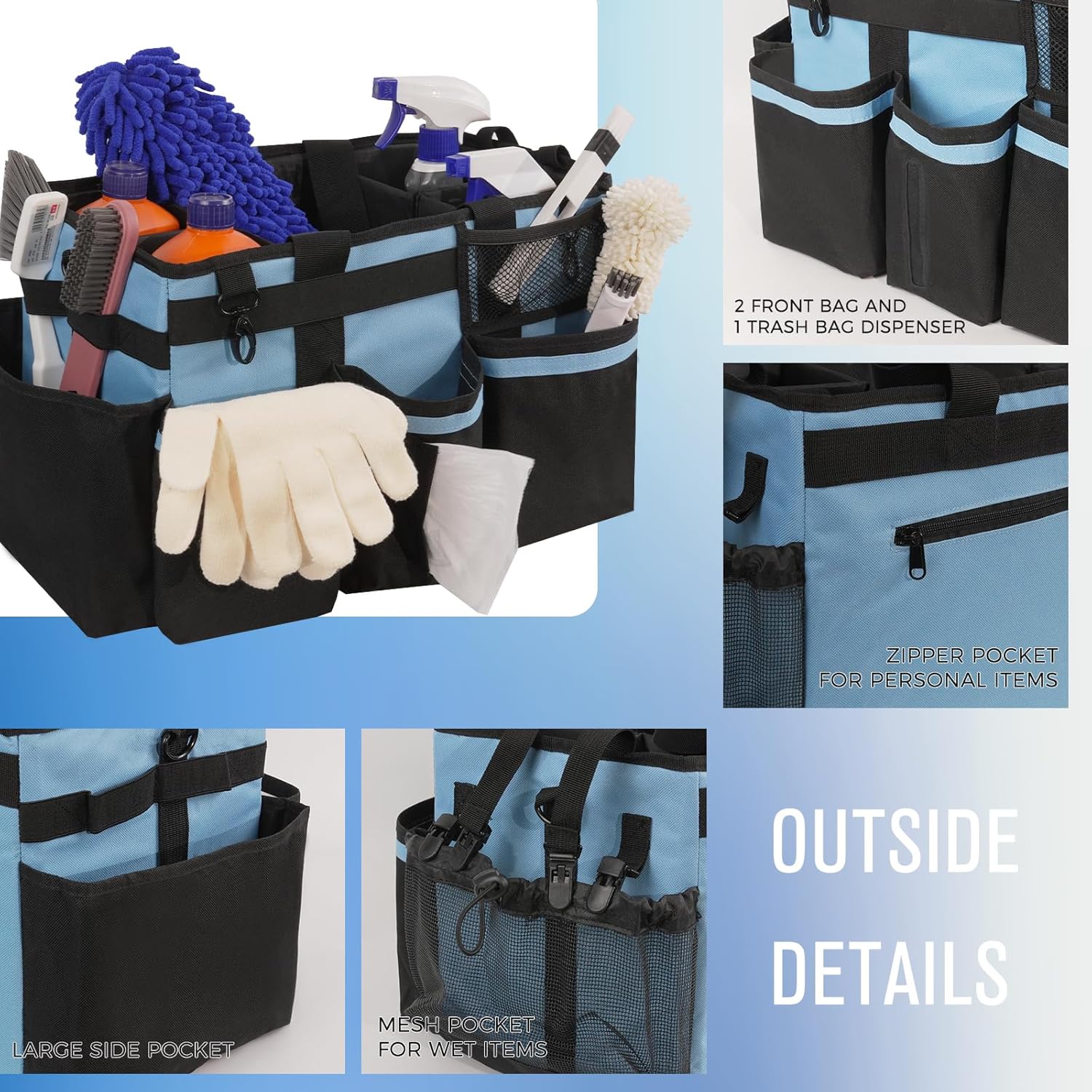 - Exquisite Details: The 5 inner compartments are large enough for organizing cleaning tools. 3 individual deep outer pockets, 1 mesh side pocket and 1 trash bag dispenser allow you storage and access of other cleaning tools. Also, securely zipped pocket is design for safely storing your important items