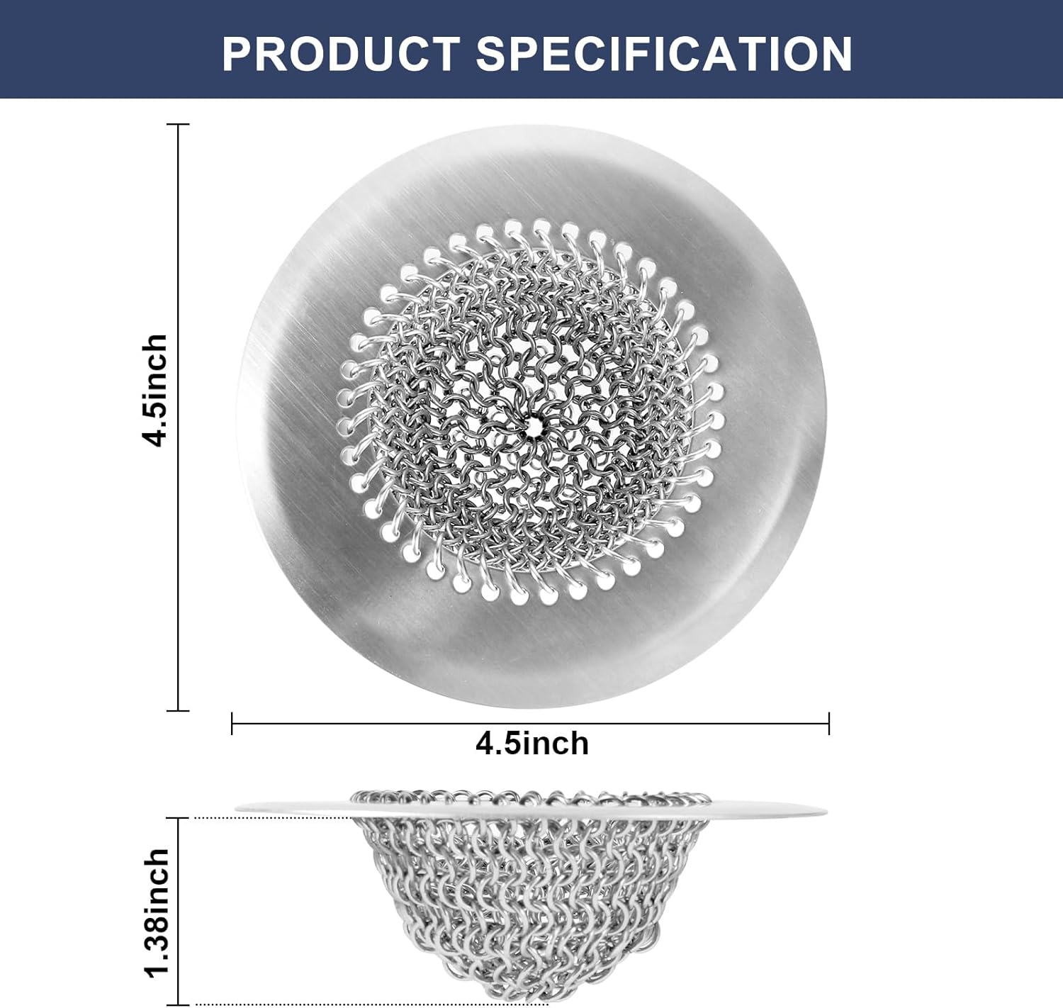 - Size: 4.4 inches in diameter. Our metal sink strainer is a universal size that fits most sink sizes. It will be a great addition to your kitchen life