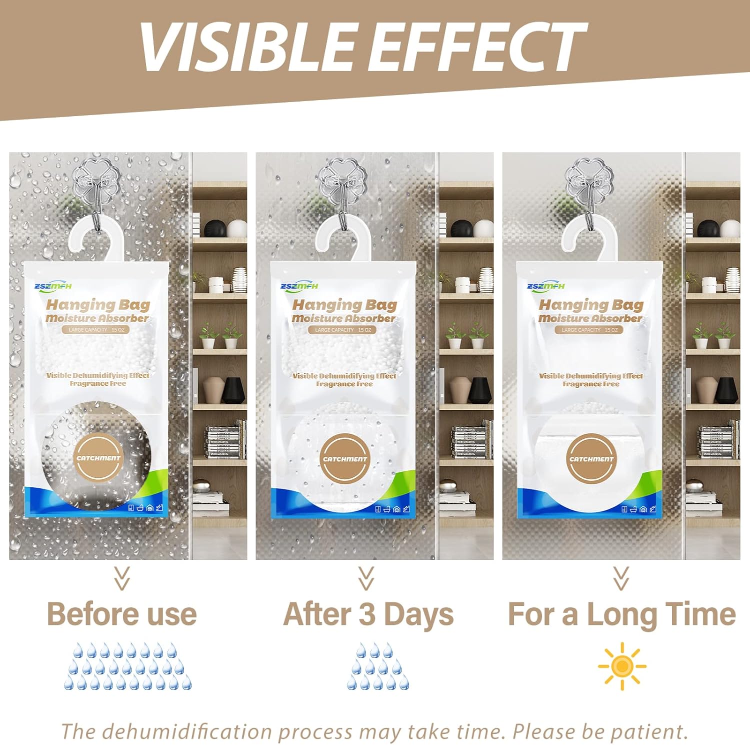 - ❤Clever Design:The upper part of the moisture absorber uses pure white DuPont paper, and the lower part is a transparent bag, so that it looks clean and tidy, and the entire water absorption process is clearly . Lasts up to 60 days (Duration will vary depending on temperature and humidity) .