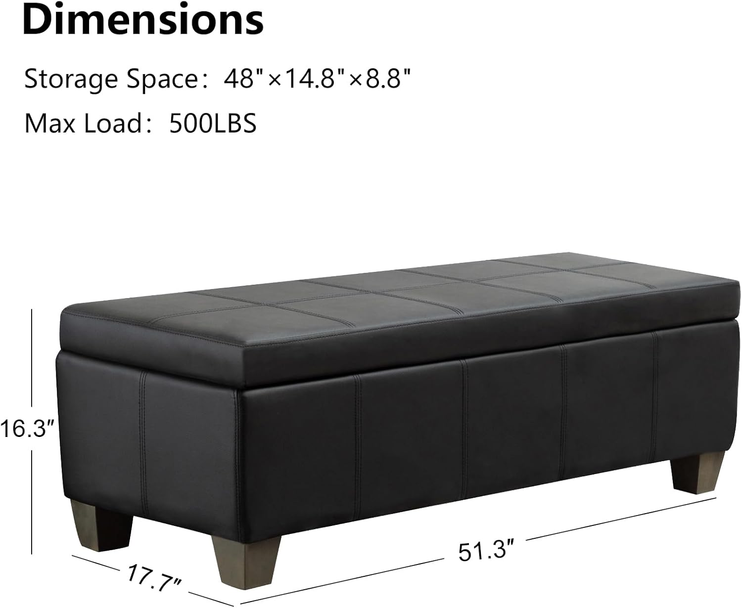 - OVERALL DEMENSION: The overall size of UDAX faux leather ottoman is 51.3‘*17.7’*16.3‘ and the inside storage dimension is 48’*14.8‘*8.8’. Our storage bench is wide enough to sit cozily and large enough to store your blanket, clothes, children's toys, and so on. It has plenty of space to help you organize every corner of your home.