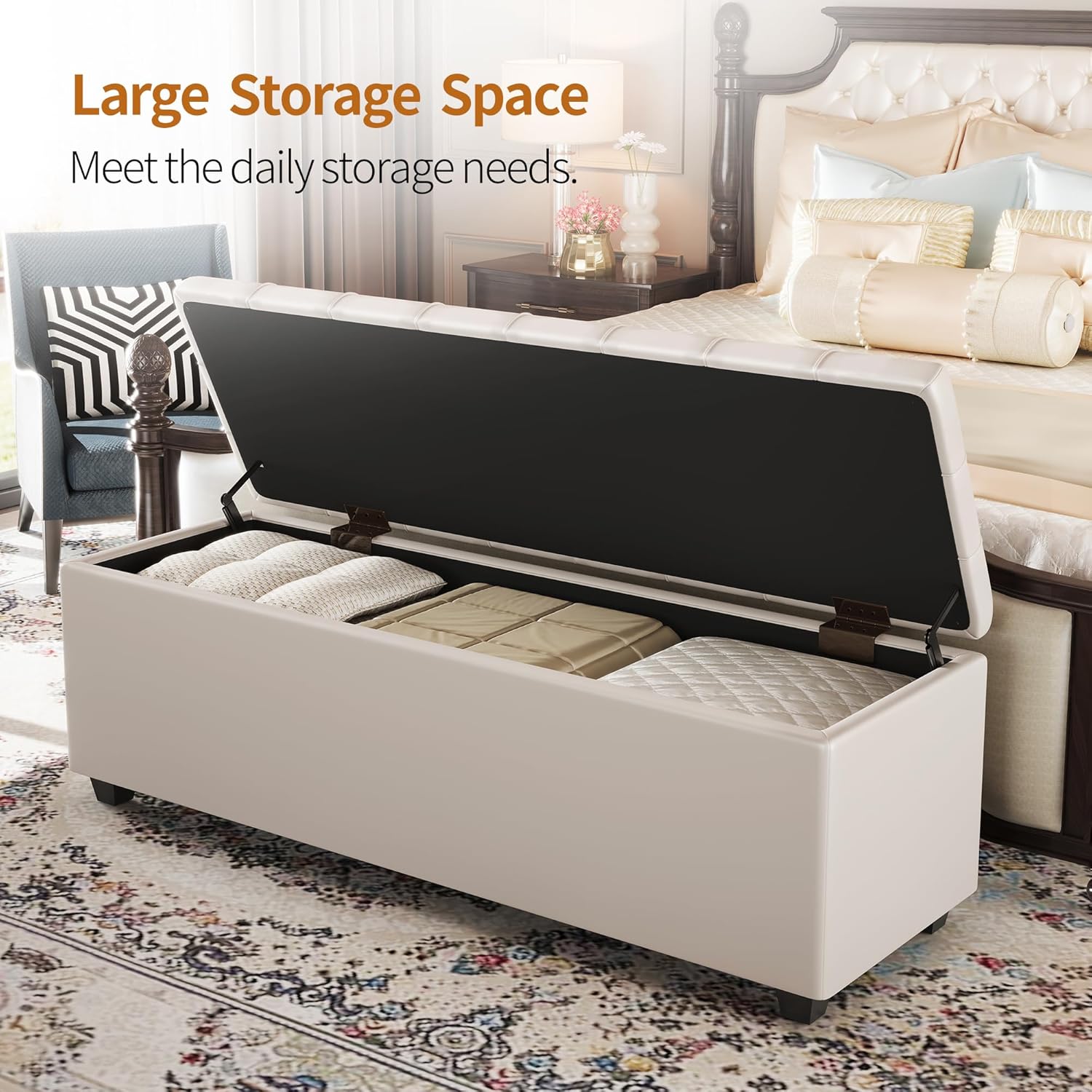 - γ Easy Assembly & maintenance γ 4 legs assembly required only when it comes to set up this modern bed storage trunk.Leather surface is resistant to dirt and easy to maintain. If it gets dirty, It can be easily wiped clean with a damp cloth