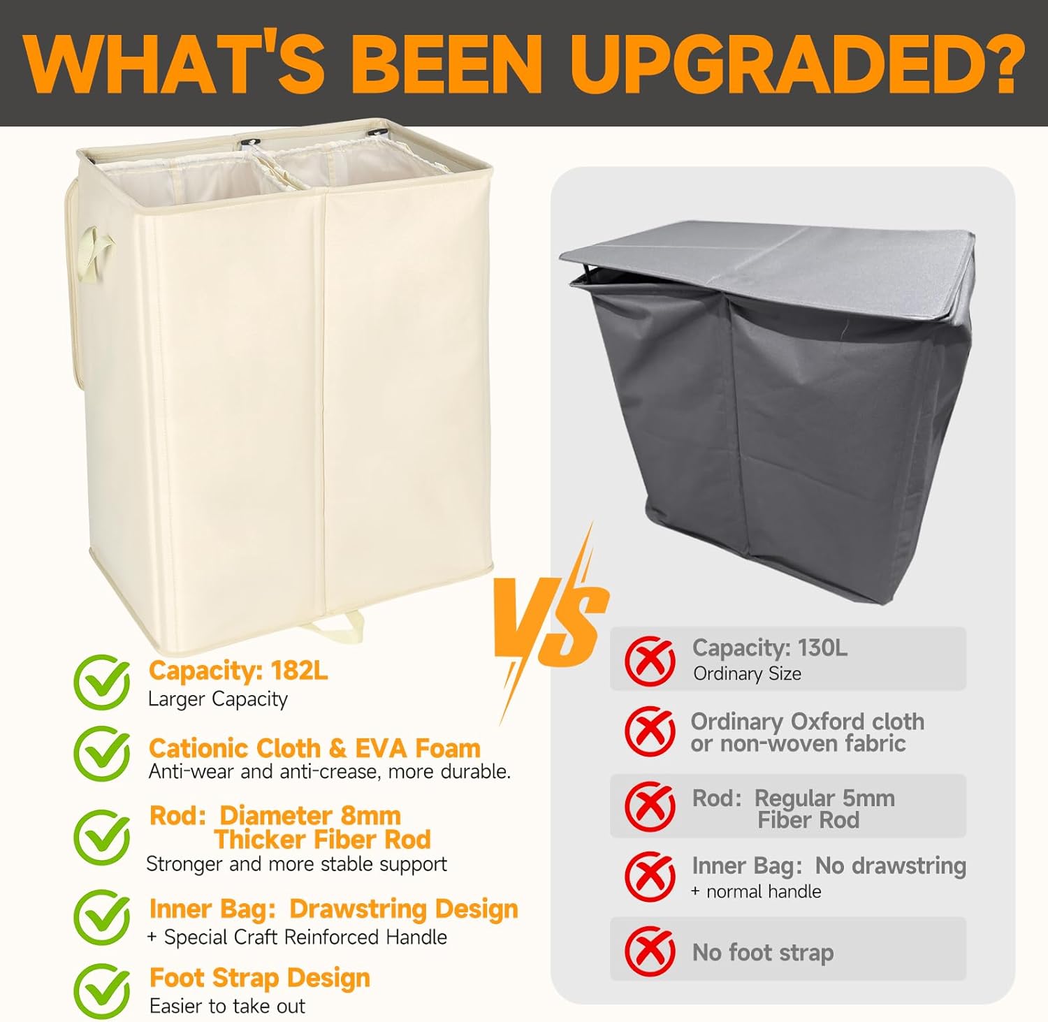 - ăSize UpgradeăThe double compartment clothes basket measures 23.62x 15.75 x 30in with a huge capacity of 182L, which can hold 6 loads of laundry, and each compartment is 91L which can hold 2.5-3 loads of laundry individually