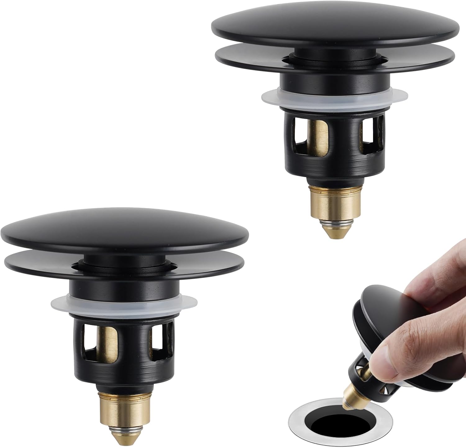 Universal 2PCS Bathroom Sink Stopper 2 in 1 Pop Up Metal Sink Drain Strainer with Hair Catcher, Fit for 1.1~2.36" Sink Basin Hole, Big Cover Cap, Anti-clog, Matte Black